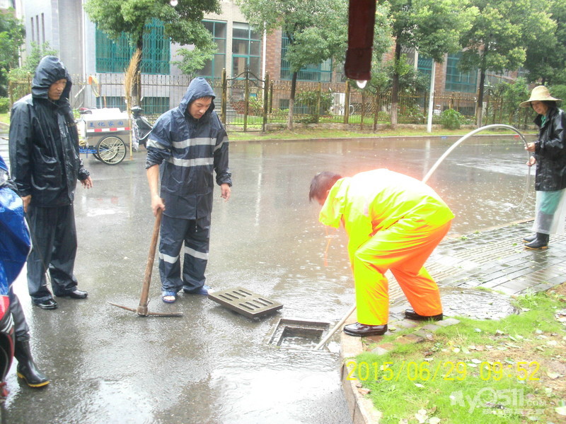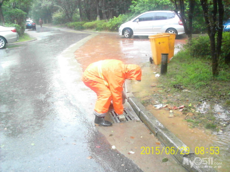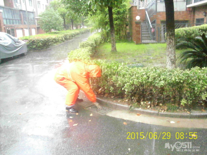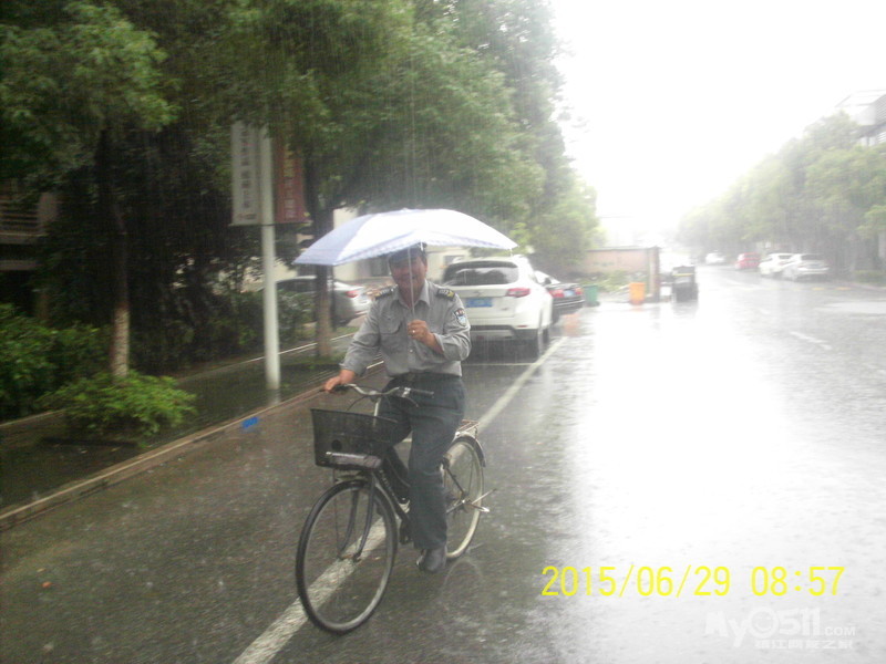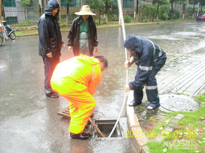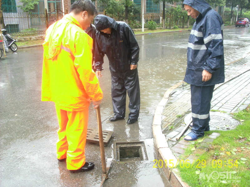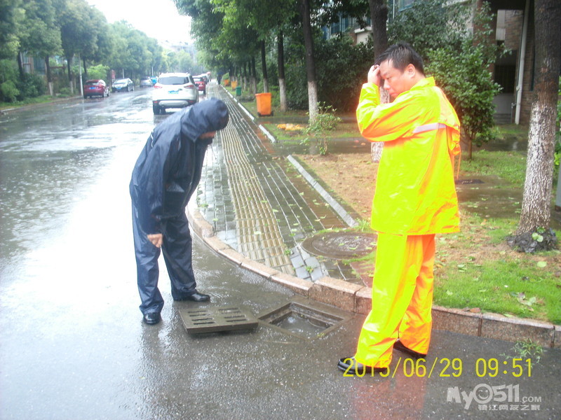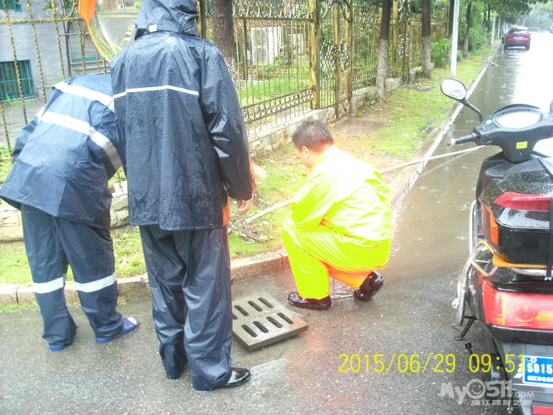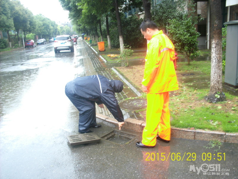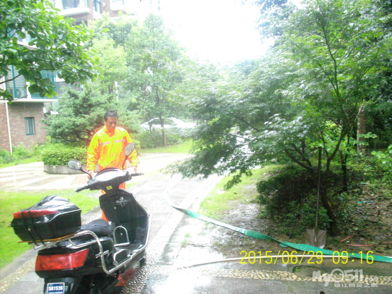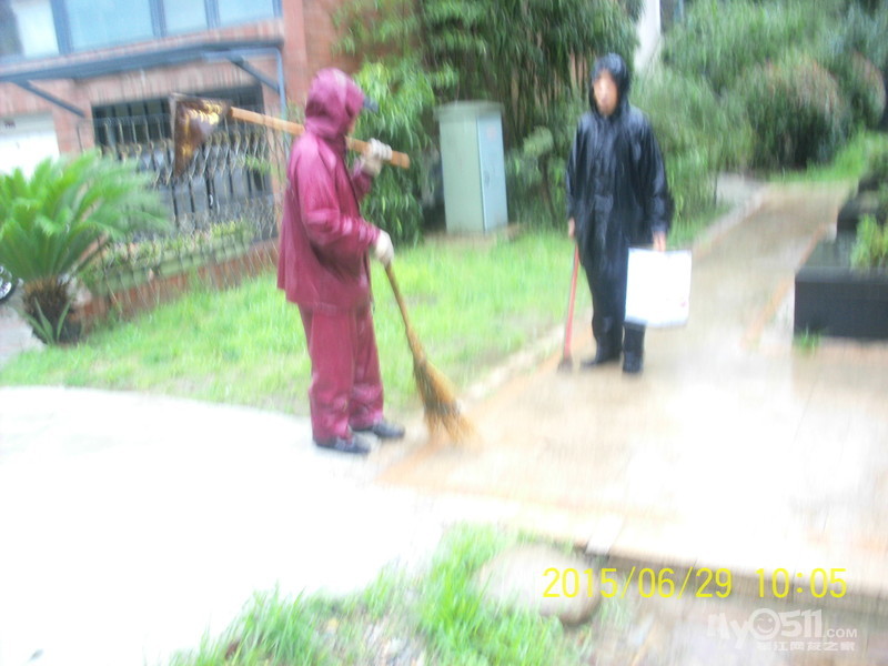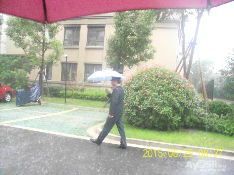2015年6月29日,雨季,维科物业公司物管员及保安员、保洁员奋战在第一线,保证了江山名洲小区安全度过汛期。    保安雨中巡逻