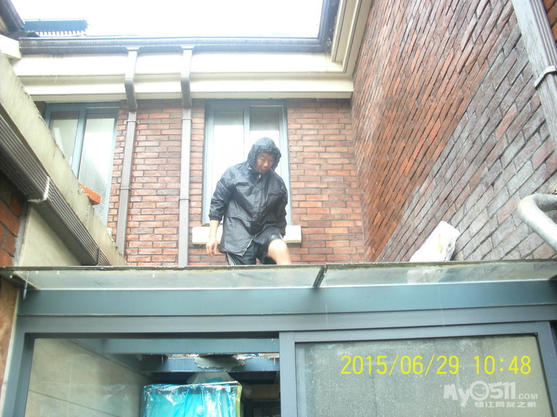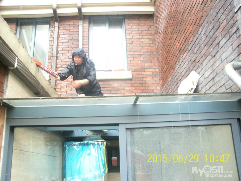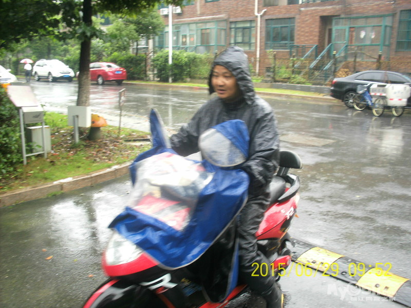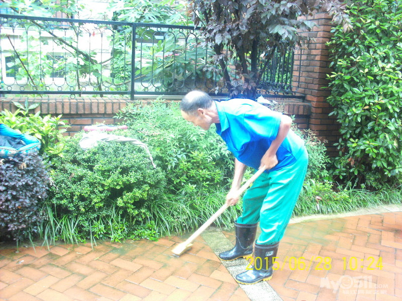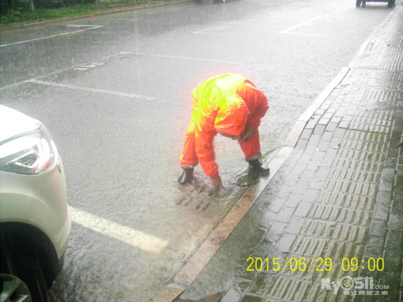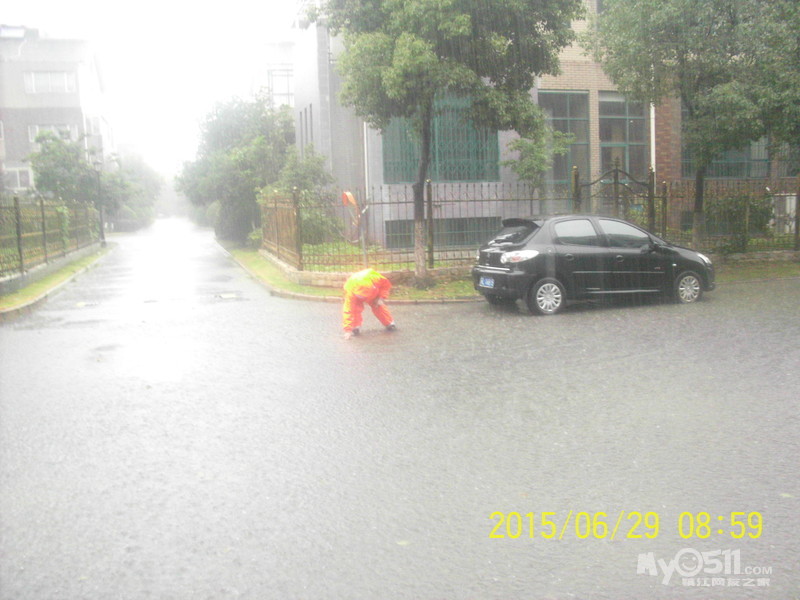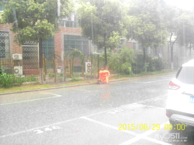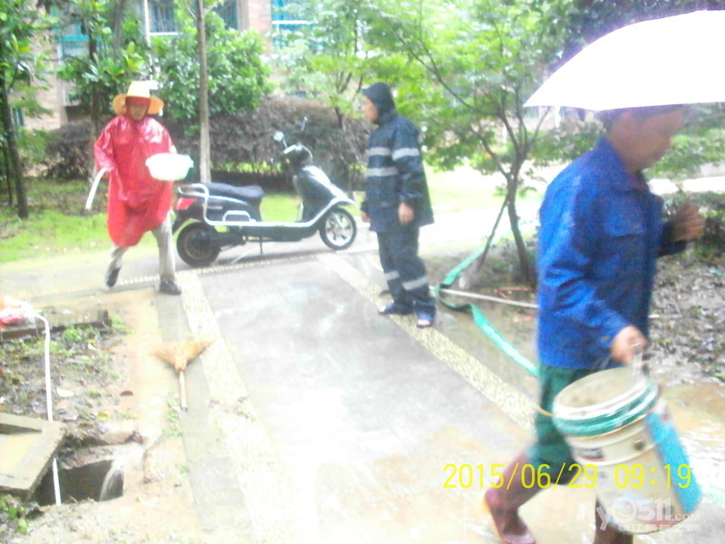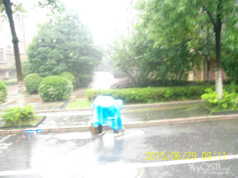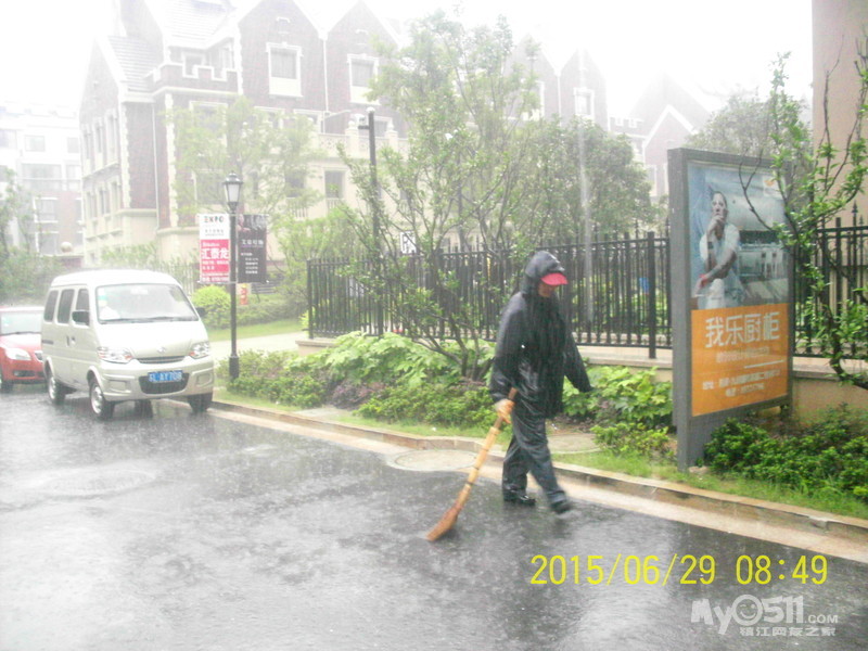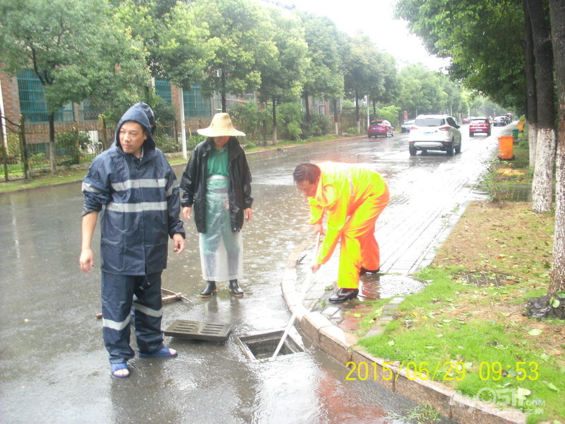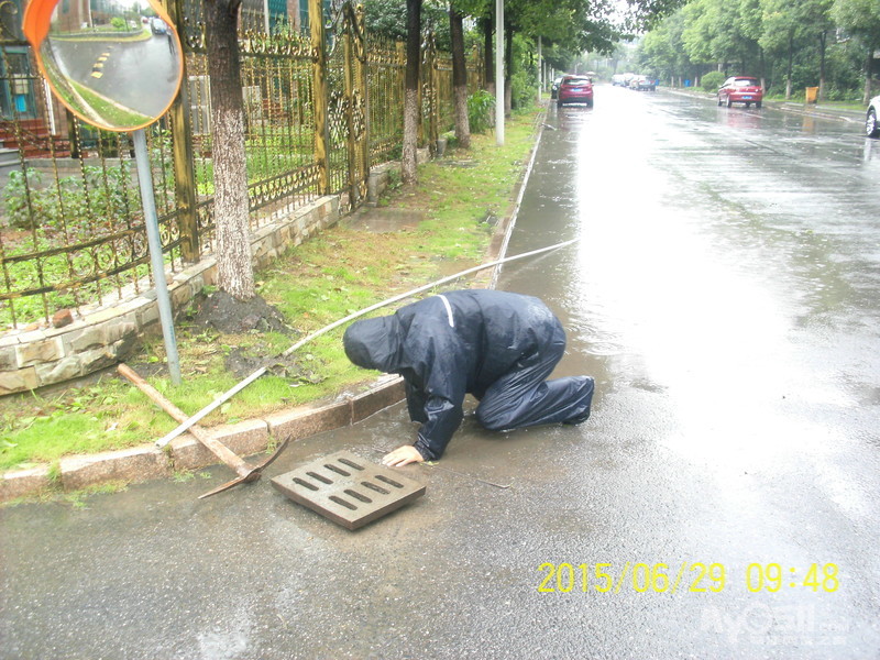 2015年6月29日,雨季,维科物业公司物管员及保安员、保洁员奋战在第一线,保证了江山名洲小区安全度过汛期。    保安雨中巡逻