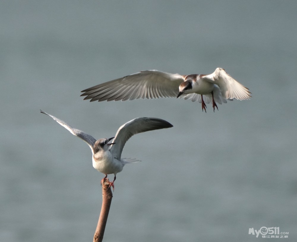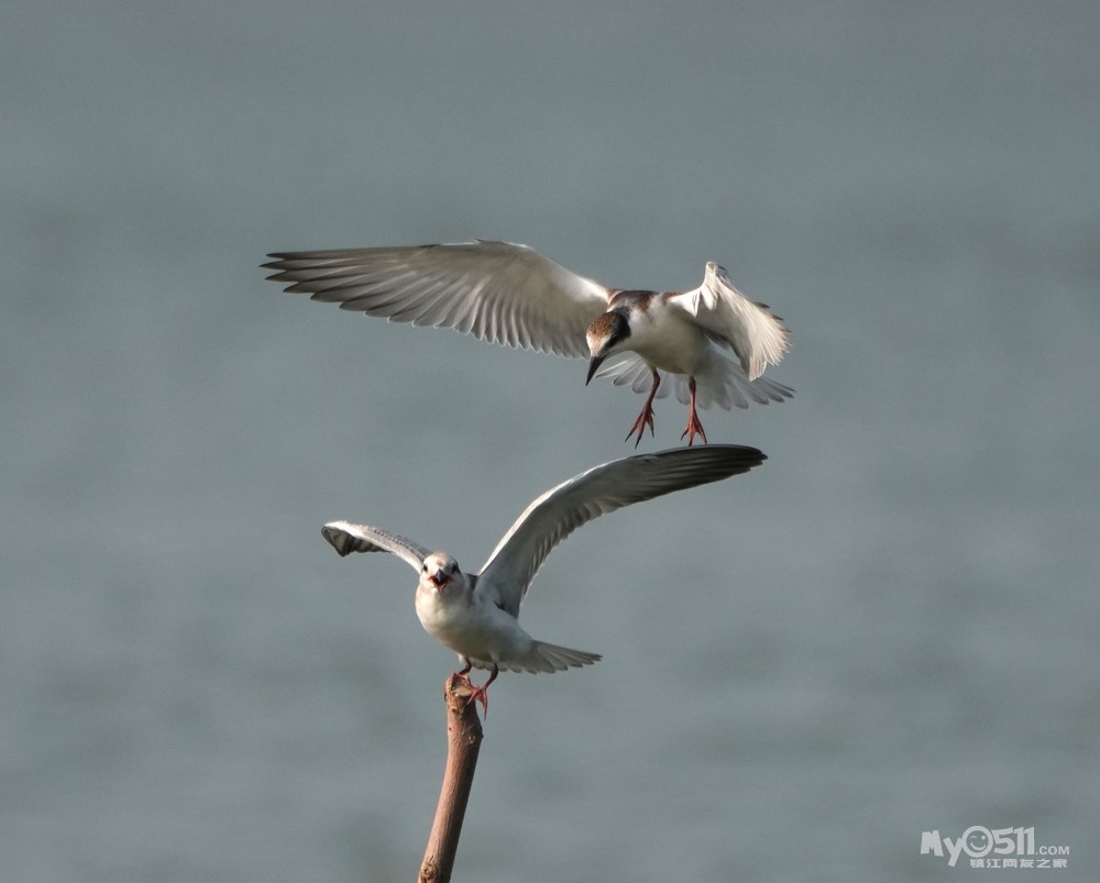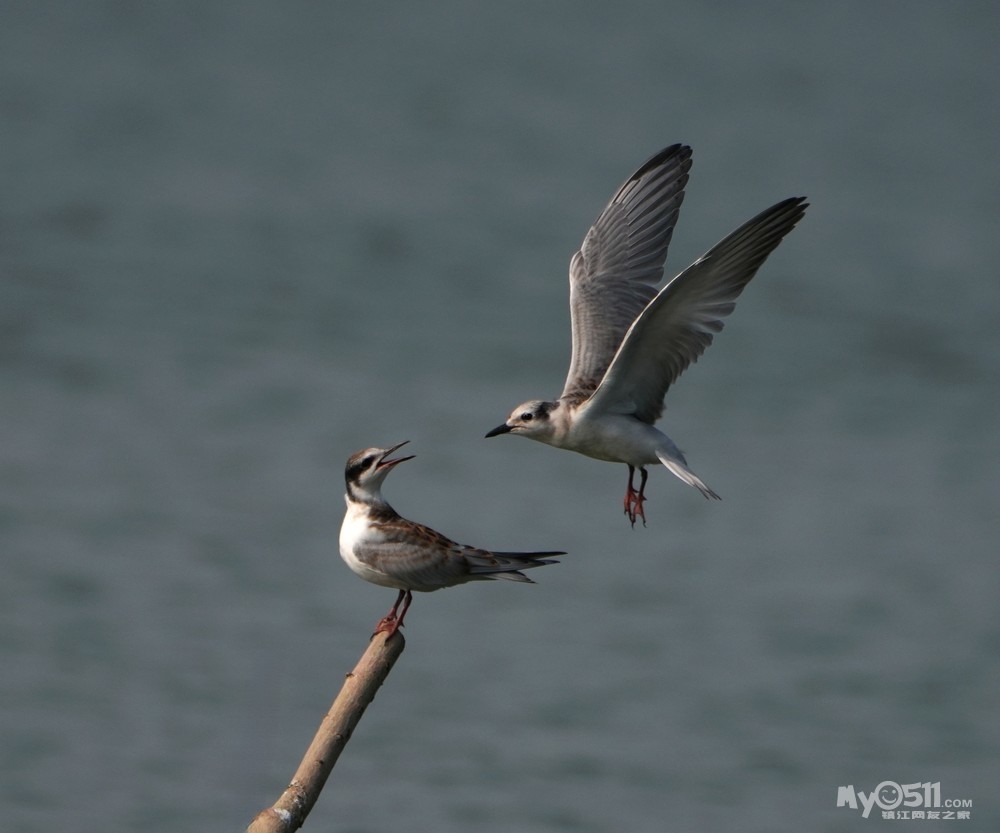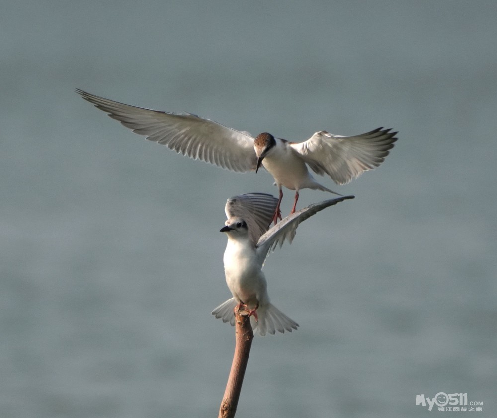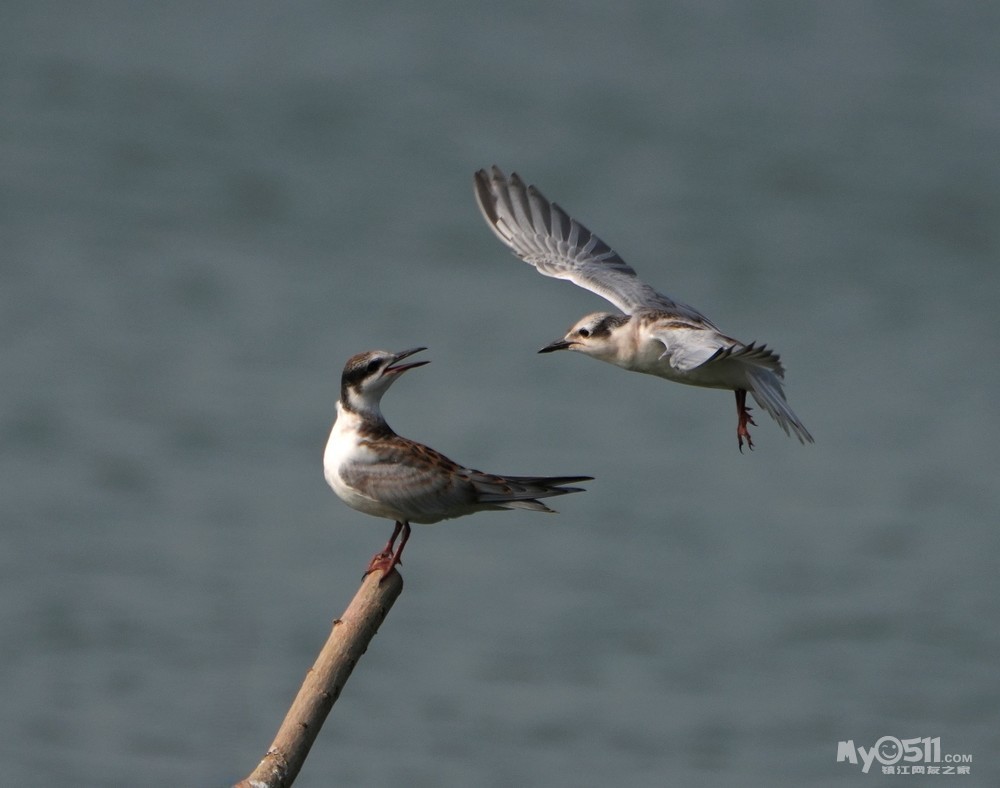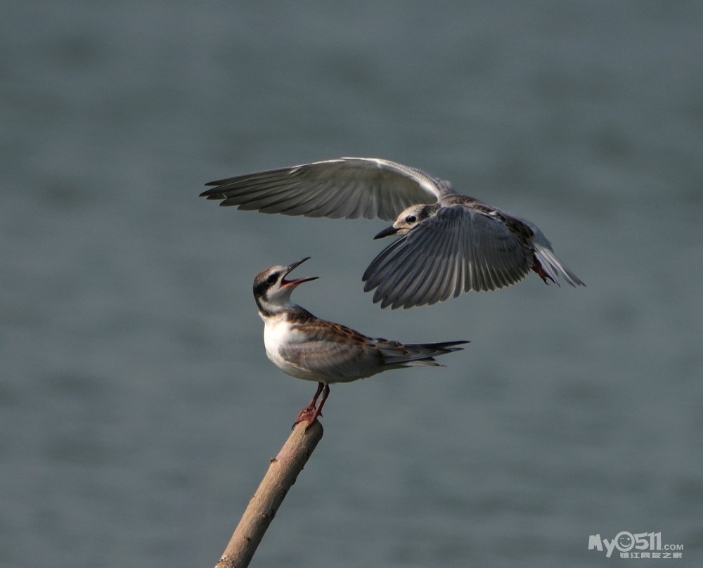 > 须浮鸥幼鸟桩上打斗玩耍