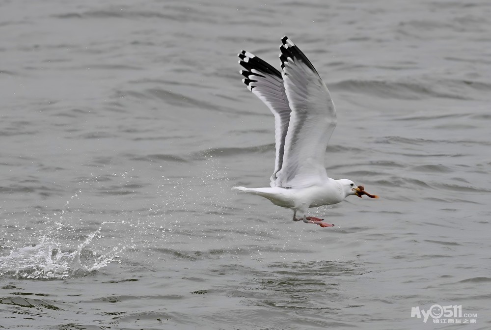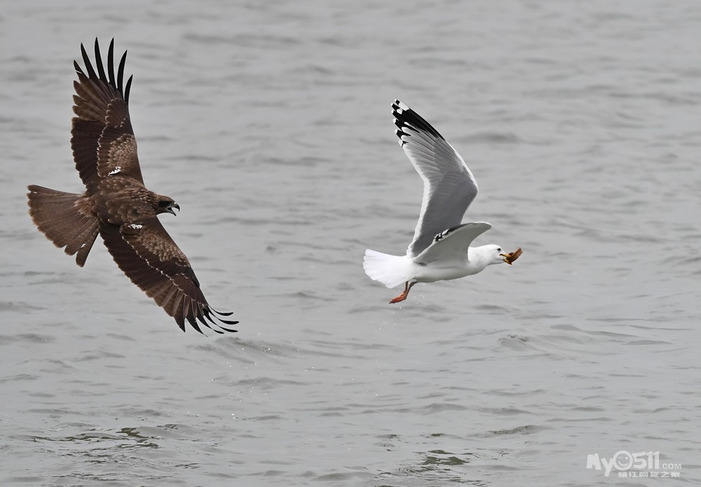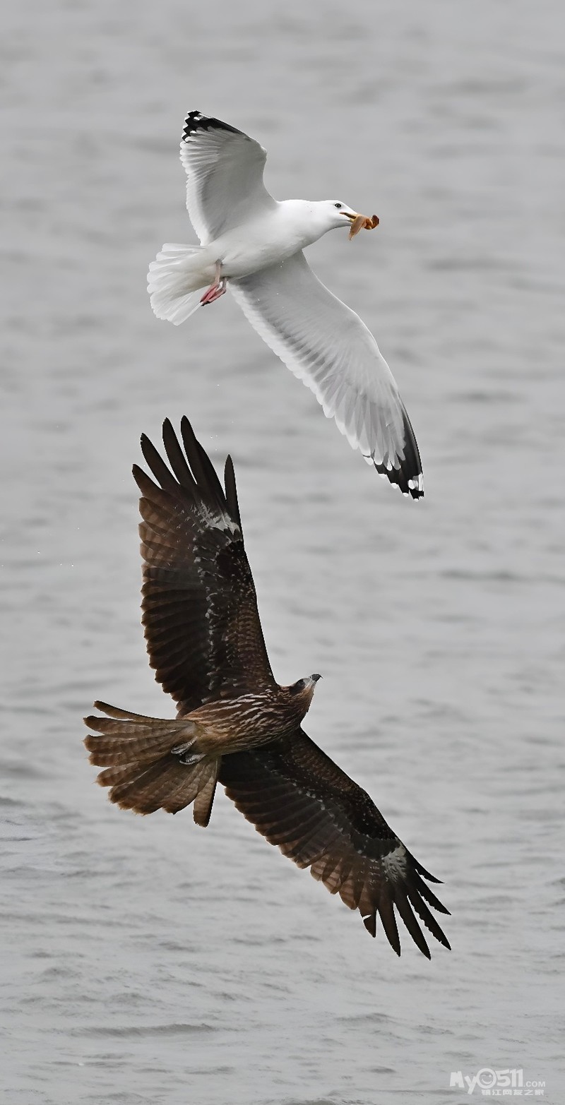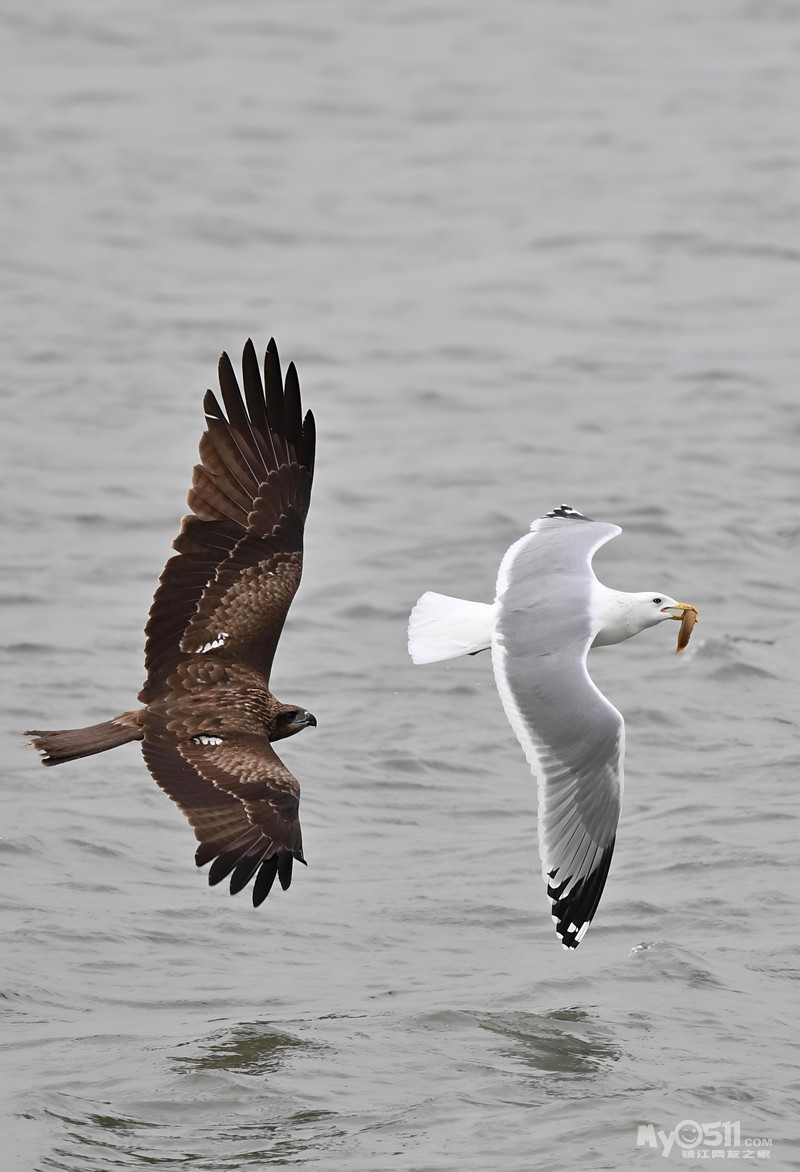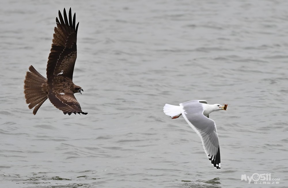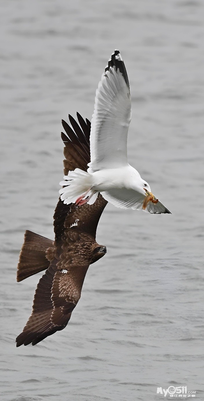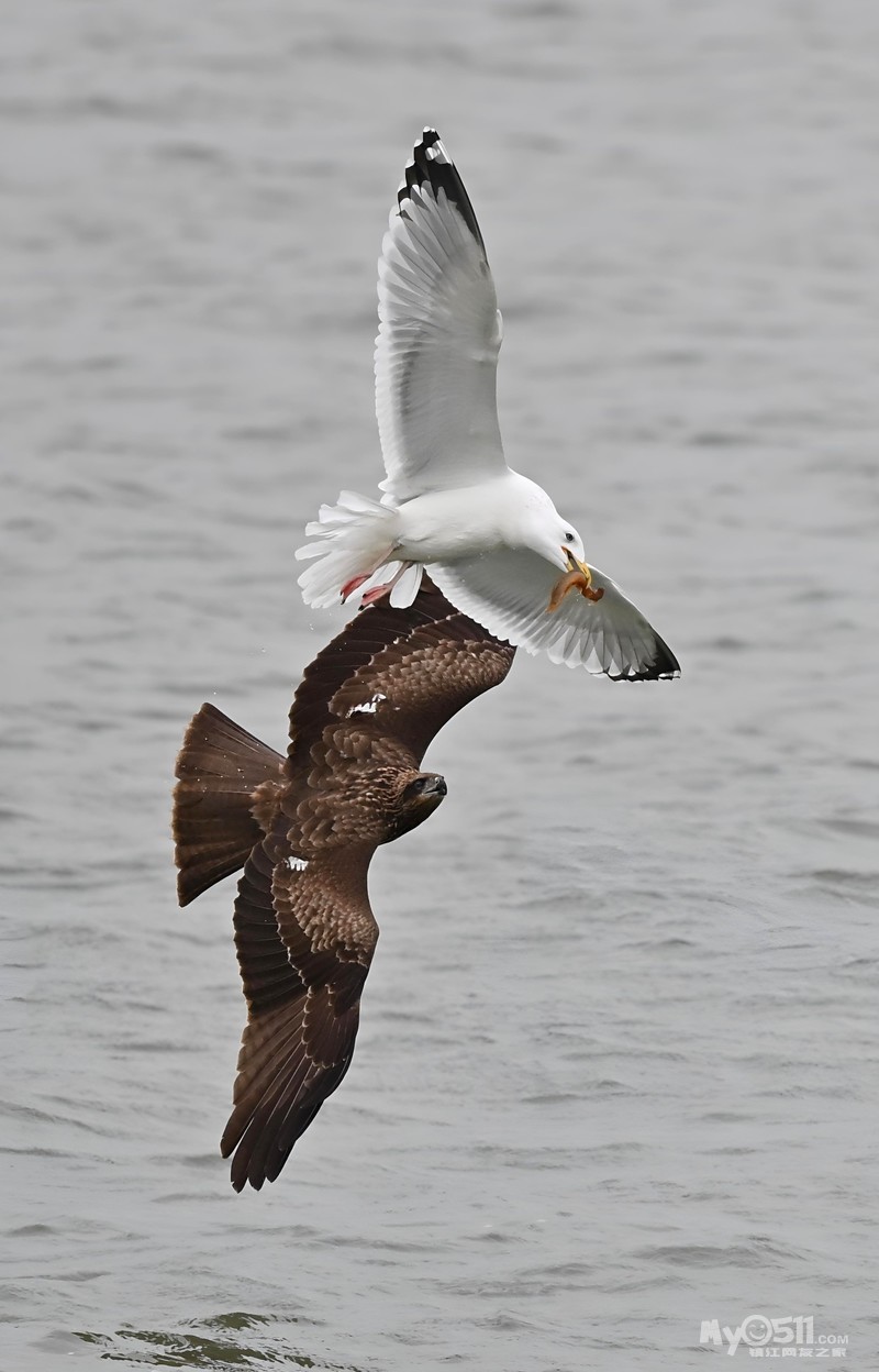 银鸥捉了一条泥鳅,一只老鹰(黑耳鸢)俯冲而下追了过来,目的是银鸥口中的食物,于是乎一场追逐赛在平静的金山湖湖面上空展开了……