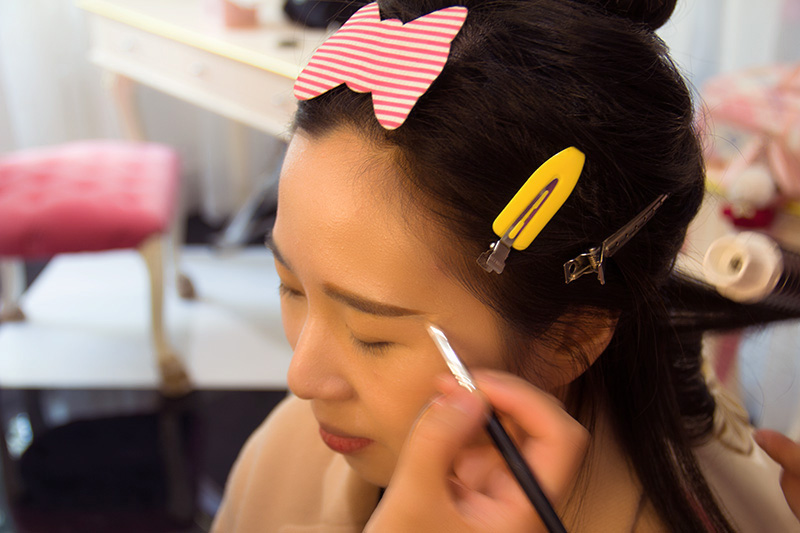 下面就是眼睛部分,新娘的眼睛属于内双,并且有一定程度的大小眼,化妆师把双眼皮贴剪成细长条撑出欧式大双眼皮的同时矫正大小眼的情况。