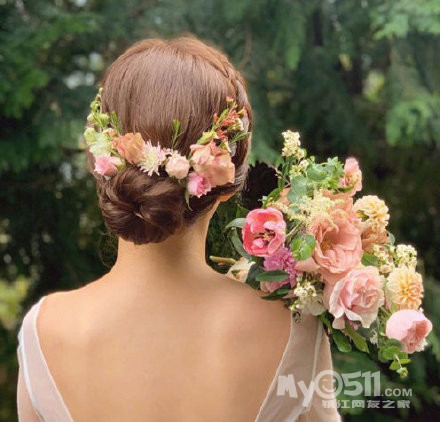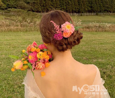 再配上颜色鲜艳的花朵点缀的编发