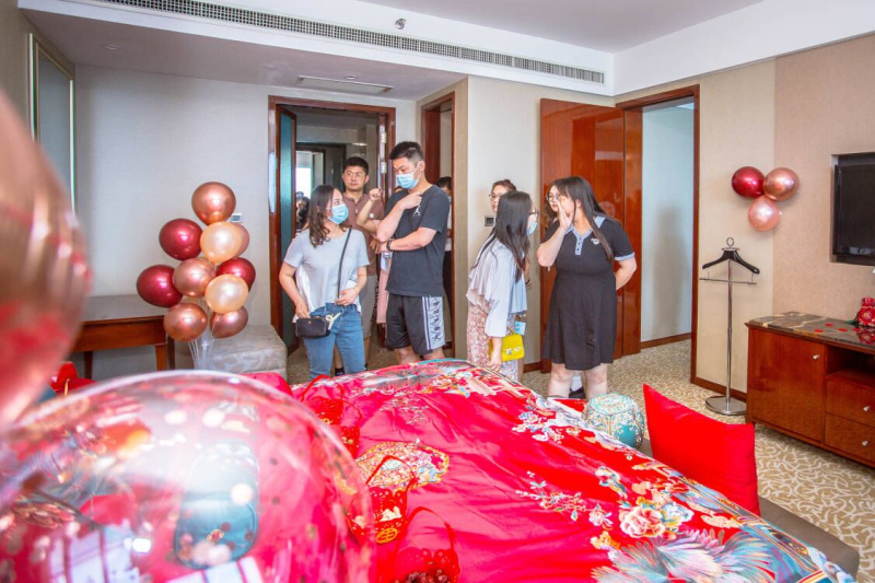 本次活动现场分为喜饼DIY、酒店宴会厅、婚房参观、游戏互动、商家优惠分享等环节