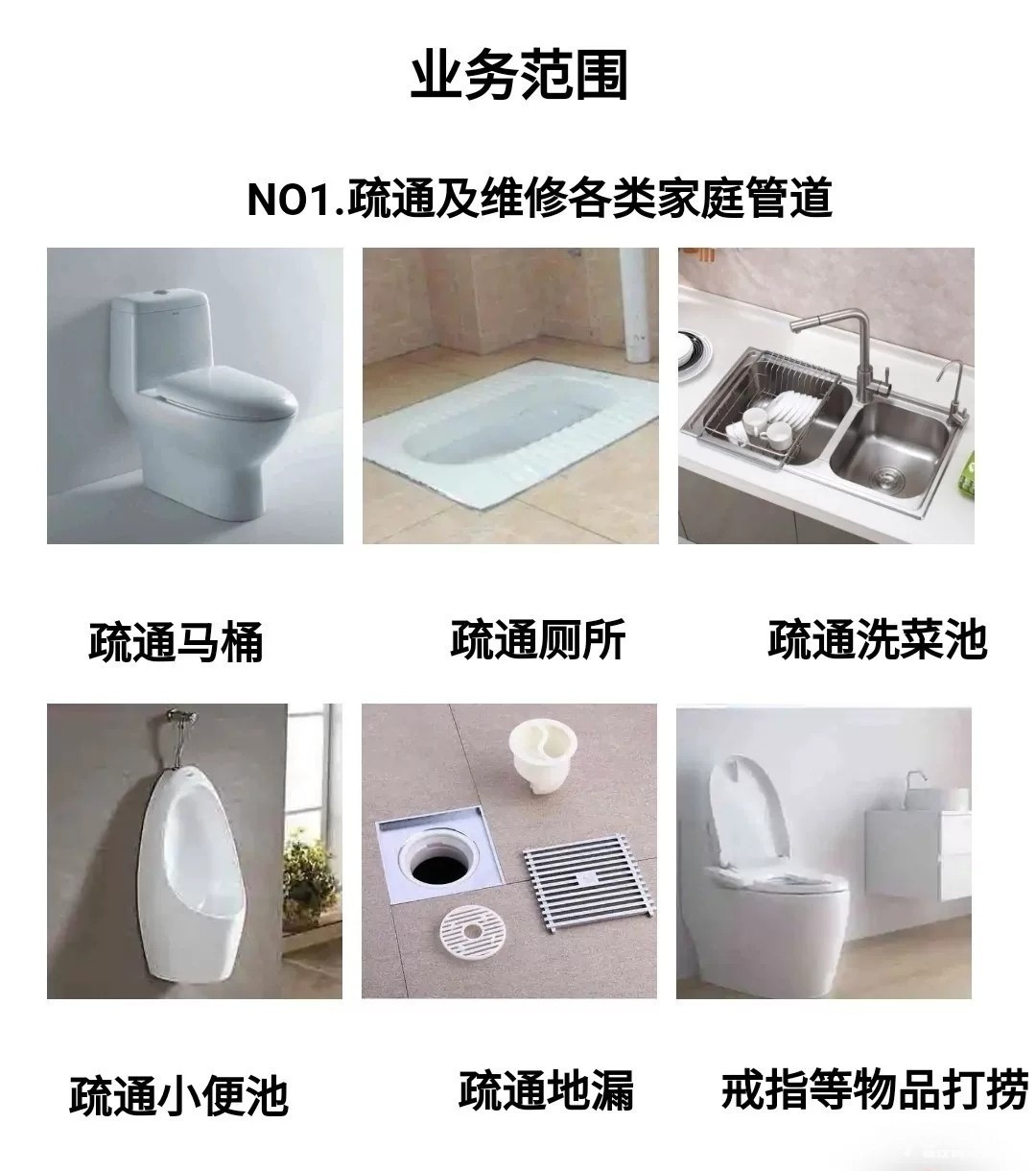 1.通马桶,通蹲坑,通地漏,通洗菜池,通洗手池,专业疏通各因(抹布、清洁球、塑料)等各种软硬物质所造成的管道堵塞)