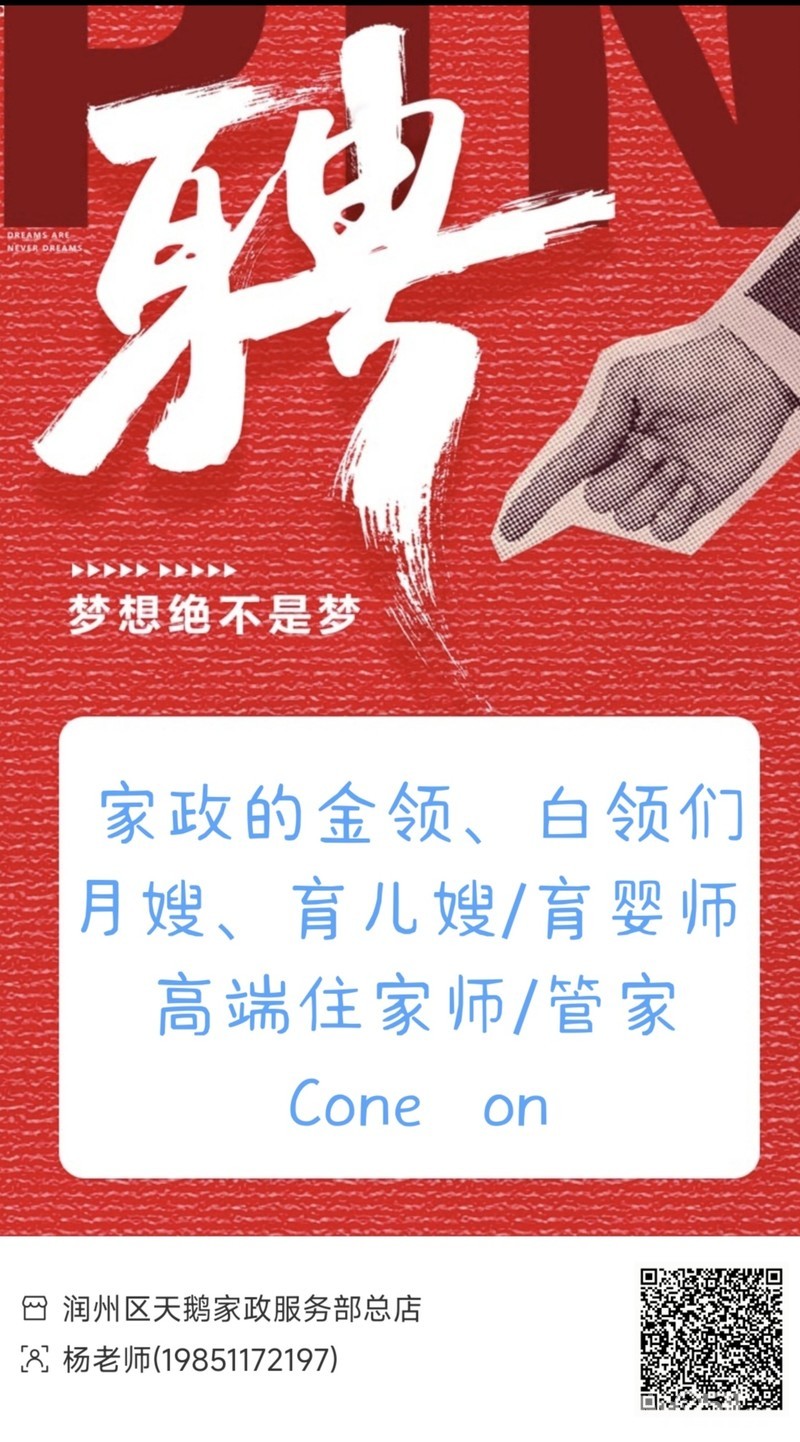 扬州仪征,需要50岁左右的住家育儿嫂,女宝宝2个多月,需要晚上带睡,简单打扫卫生,希望阿姨脾气性格好、不要强势的,有体检报告,最好可以烧饭的,单休,9000~9500元/月,国假正常休息,详情面议