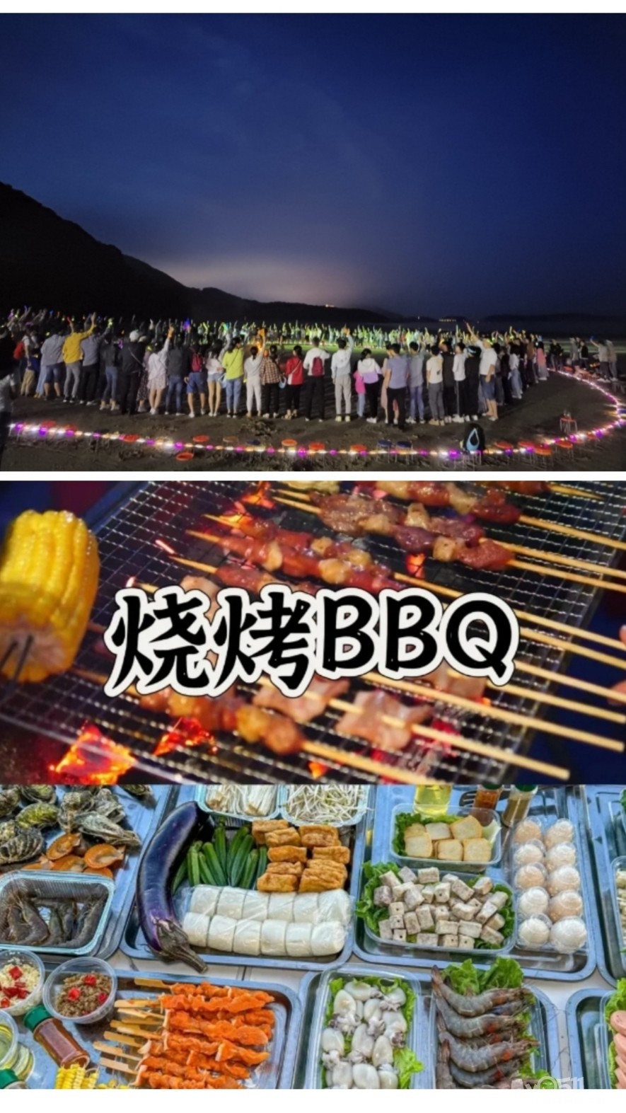 沙滩木材篝火晚会含:荧光棒、音响 、点歌器、无线麦克风、柴火一堆,烟花一只。 备注:如遇天气不好,风大,木材点火取消。 自助烧烤:食材随机搭配(不少于20种) 烧烤炉子: 8-10 人一只炉子。 荤菜:鱿鱼须、秋刀鱼、小黄鱼、香辣田螺、雪花肉串、掌中宝肉串、蒙古烤肉串、五花肉、羊肉、牛肉、奥尔良烤翅尖、里脊肉、贡丸、热狗、鸭珍,牛筋串、牛肚串、猪月牙骨串 蔬菜:韭菜、娃娃菜、青菜、千页豆腐、油面筋 主食:年糕、刀切馒头      酒水:指定啤酒、雪碧、可乐(无限畅饮)  (烧烤时间不超过2小时,提供的食材全部用完 及时补给,谢绝打包、浪费)。