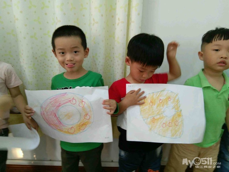 宝宝画了美味的甜甜圈,外面一个大圈圈,里面一个小圈圈,涂上自己喜欢的颜色,完成喽!