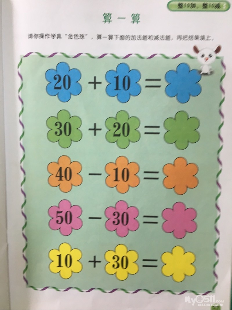 1、在操作活动中初步感知100以内数的整10加和整10减计算。