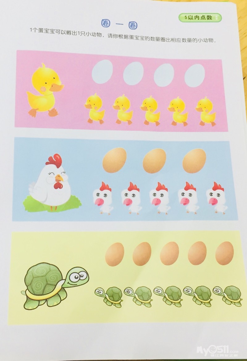 宝贝们学习了5以内的点数《圈一圈》,通过学习幼儿能根据蛋宝宝的数量圈出相应数量的小动物。