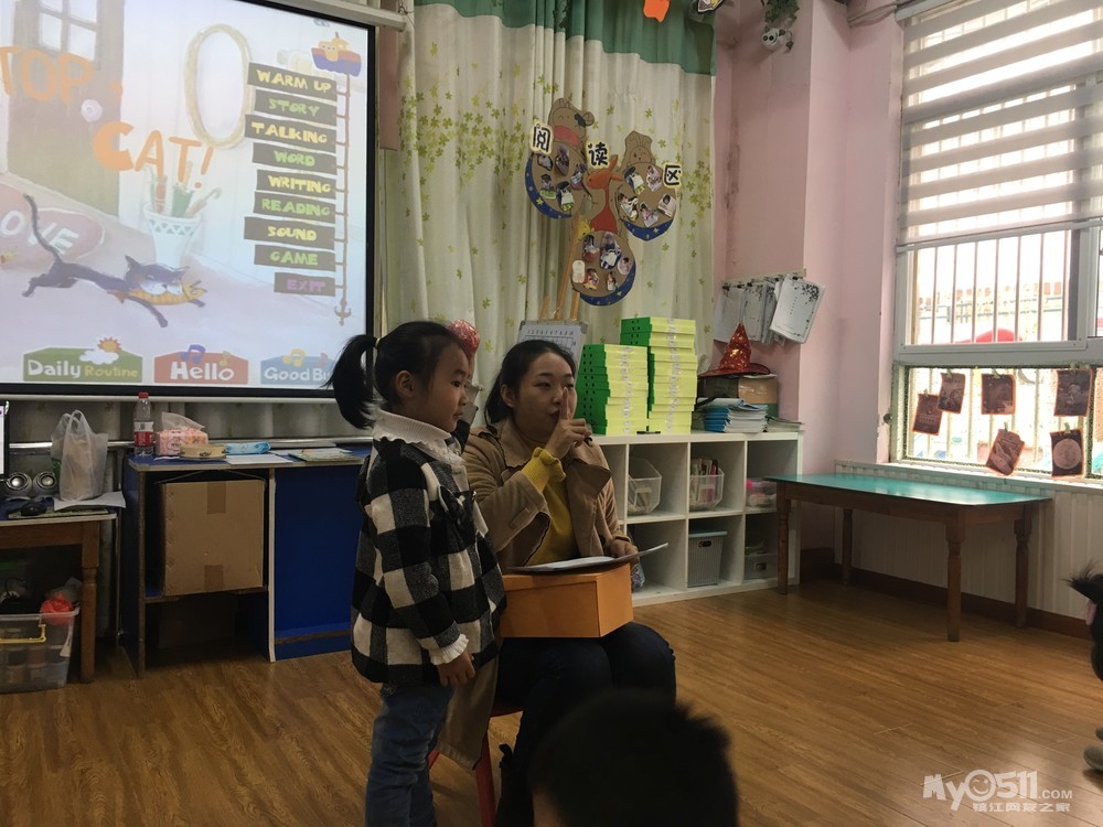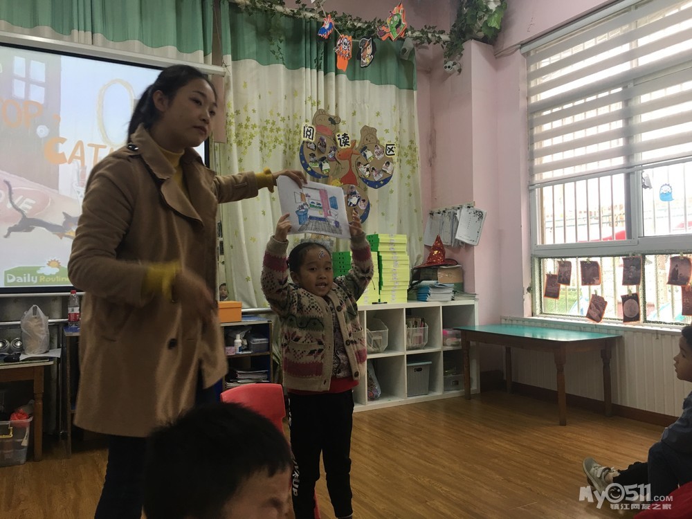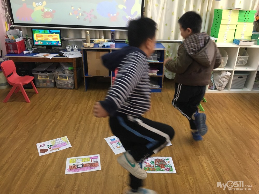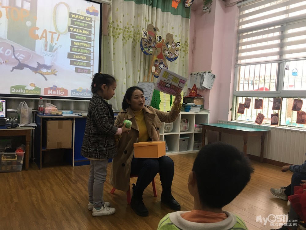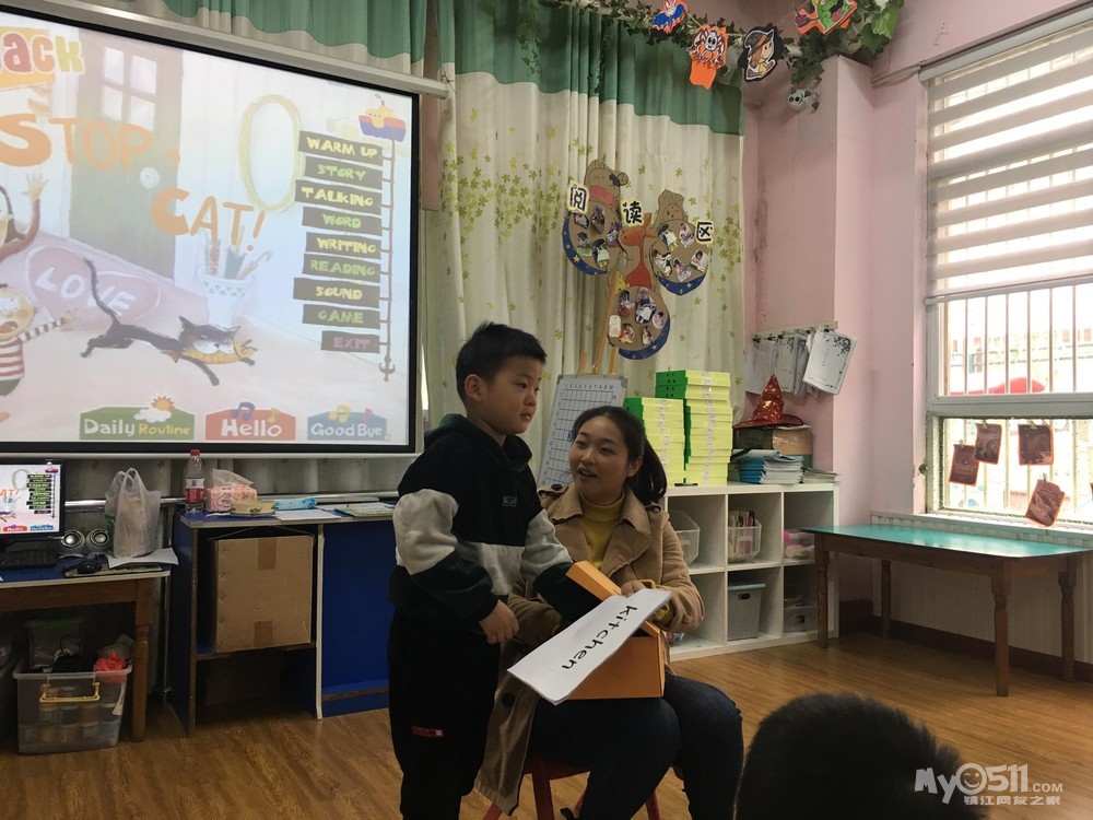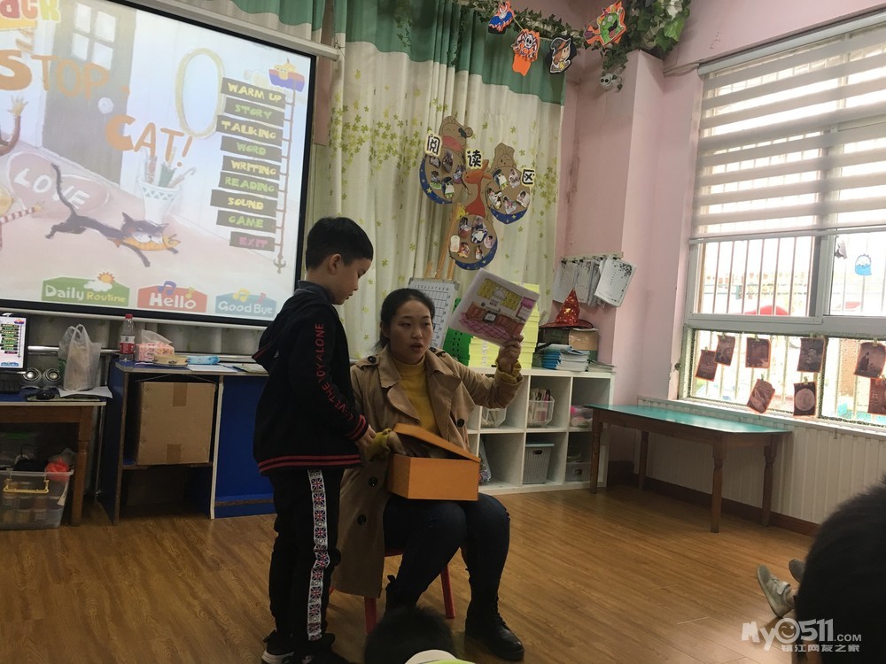 复习句型:Stop,cat!(小猫停下!)Watch out(小心)He is running into the...(他跑进...里了)
