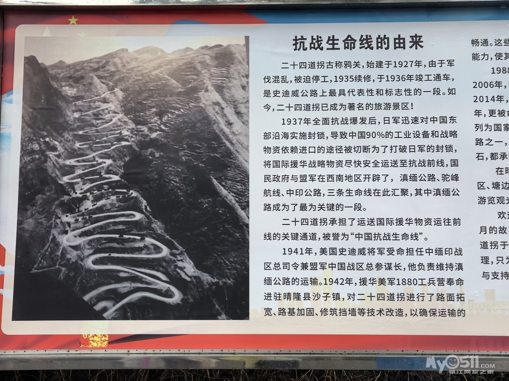 晴隆二十四拐,是滇黔公路的必经之地,因沿途有24处连续弯道而得名 。公路全长4公里,垂直高度约250米,大部分修建在喀斯特岩层之上,以“S”形顺山势修建,地势险峻。抗战期间,约45万吨战略物资经此运往抗战前线,被誉为“抗战生命线”。