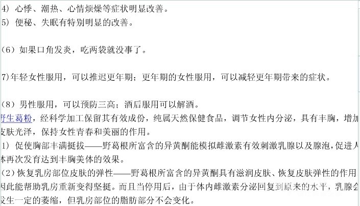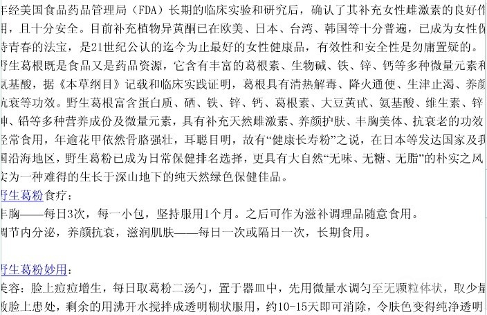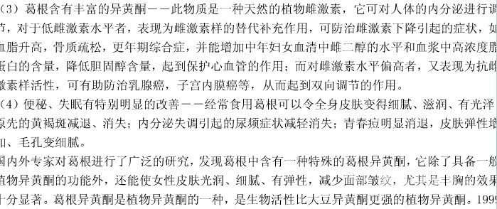 内含12%的黄酮类化合物,如葛根素、大豆黄酮苷、花生素等营养成分,还有蛋白质、氨基酸、糖、和人体必需的铁、钙、铜、硒等矿物质,是老少皆宜的名贵滋补品,有“千年人参”之美誉。