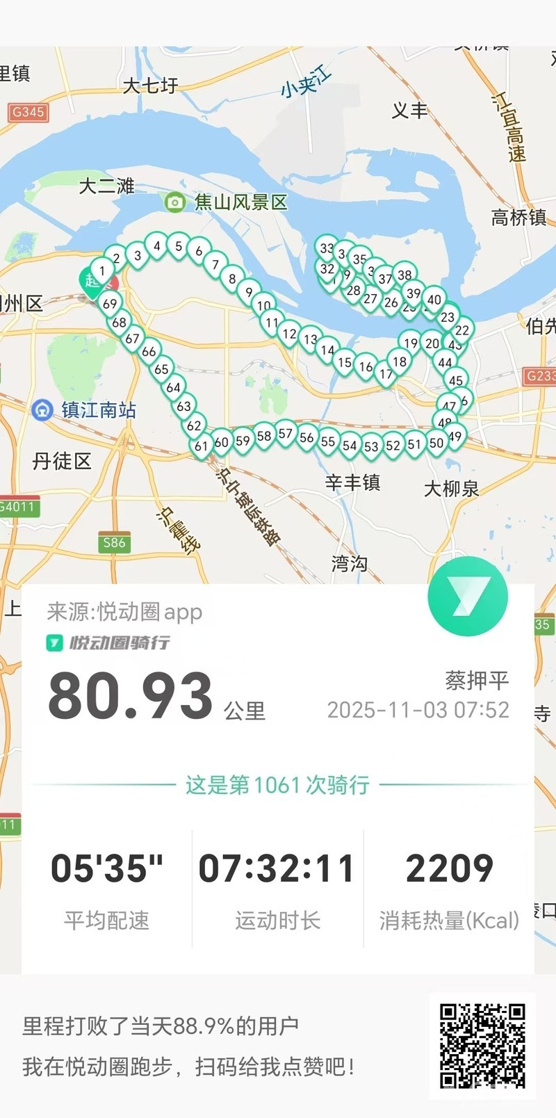 早7点52分出发骑行,沿中山路、梦溪路、东吴路、禹山路、求索路、越河路、临江西路、江心洲码头前往江心洲,采摘橘子,松林山路穿越了几个村庄,由昌平路上G346、宝平路、官圹桥路、解放路、市政路、将军巷于15点半平安到家。