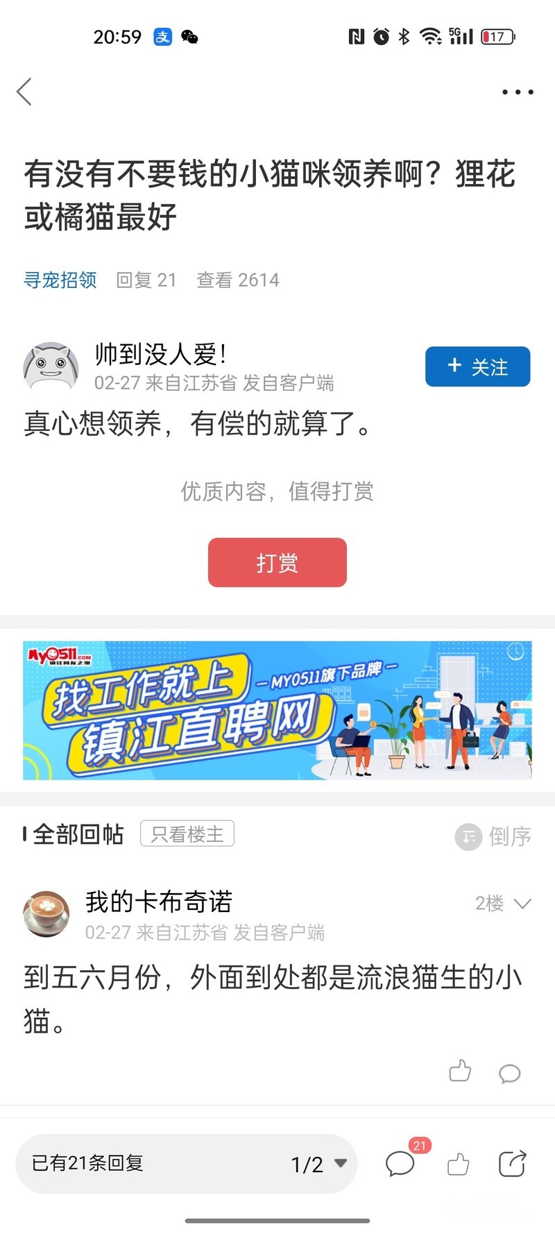 大家给猫狗找领养一定不要无偿,一定要收押金,审核好,定期回访,有些缺德的出生会在 0511 领养。