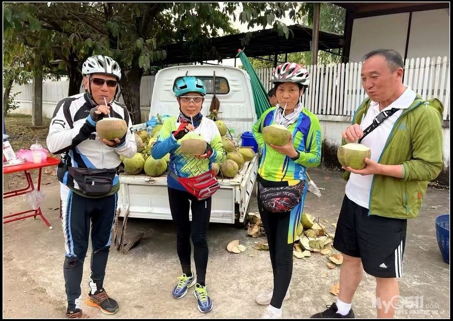 天气太热了,在路边上休息一下,每人一个椰子吃起来。