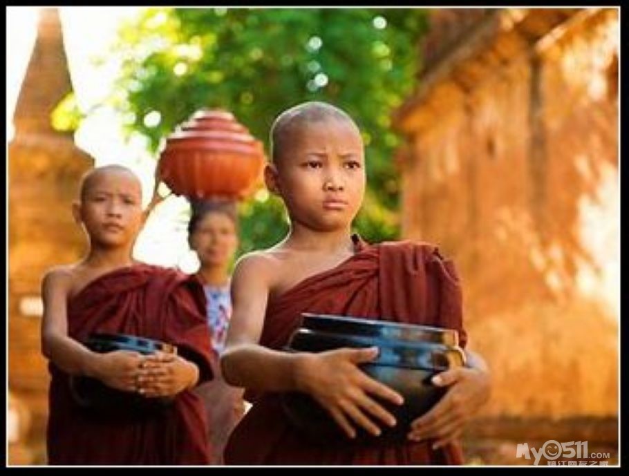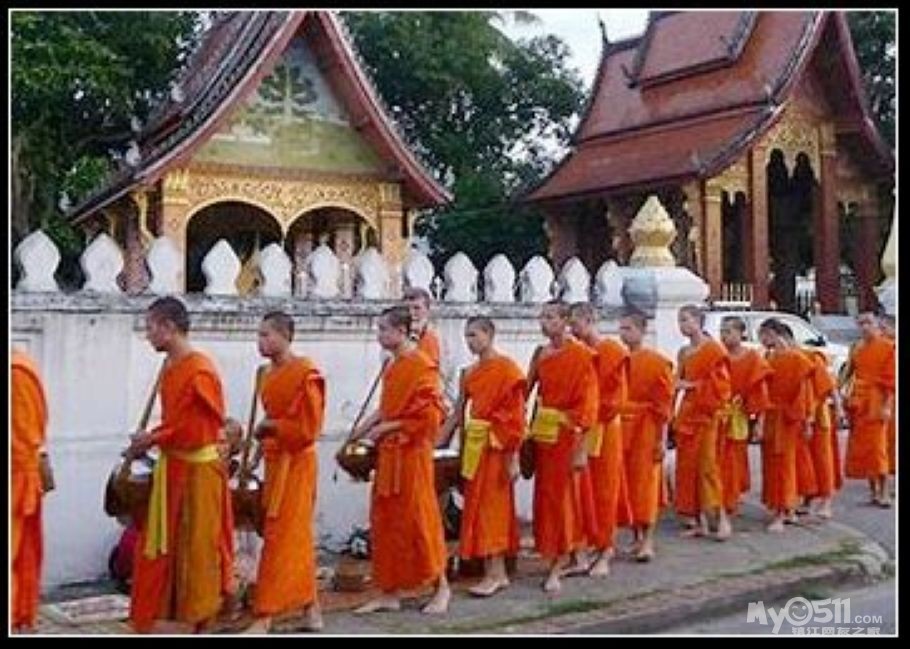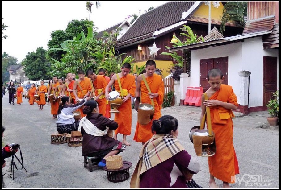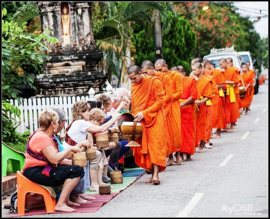 在老挝的街道上,常常能够看到身着橙色僧袍的和尚们,他们每天清晨都出来乞讨,接受信徒们的施舍。