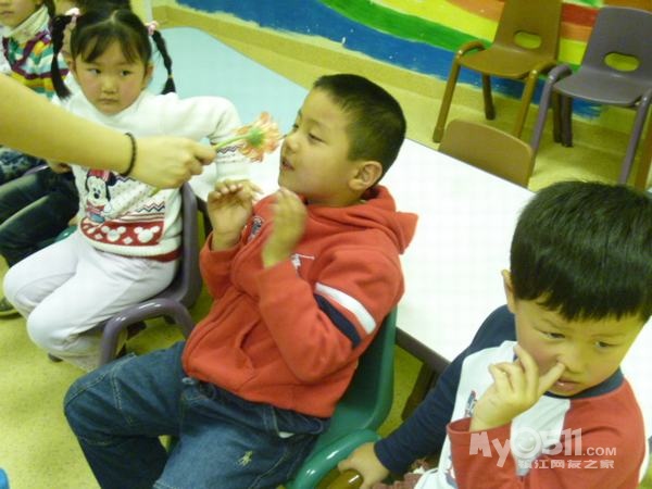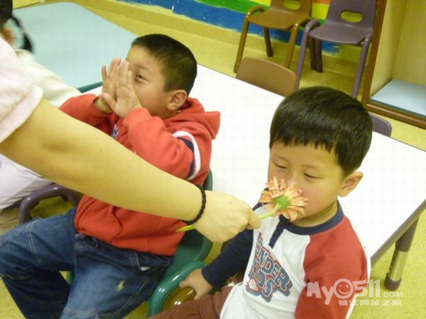 之前我们学五官的功能的时候,刚刚好Steven带来了他采的花,在学鼻子可以Smell (闻)得时候我就让孩子们去闻,他们都笑得特别开心呢。