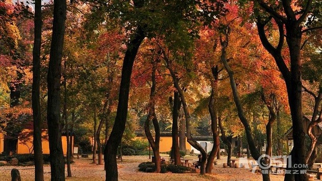 ③天平山的核心景区古枫林,有数棵年逾400的老枫树,叶变分五色,十分特别。中间夹杂几棵老银杏,色彩艳丽与老建筑相辅相成,超级壮观