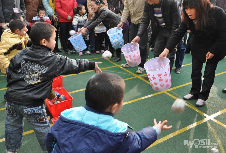 活动玩法:家长站在终点手持篮子,幼儿站在起点往篮子里投球,时间是1分钟,篮子里纸球最多的胜利。