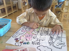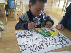 当孩子想要画一件事物,却不知如何表现时,请您以“言语”来引导他做画。例如:孩子想画“大象”,您可先和他一起讨论大象的特征,若能辅以图片或书籍,加深孩子的印象,甚至带孩子到动物园观看,都能加强孩子对画作内容的表现欲望及构成概念。然后,鼓励孩子以基本形状---圆形、正方形、三角形,分别做头部、身躯、四肢的描绘。“想一想,大象的头和长长的鼻子像什么形状?圆形还是长方形?”“很好!身体又是什么形状呢?”“长方形。”