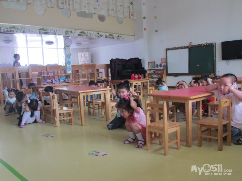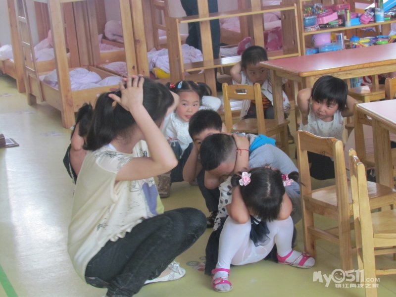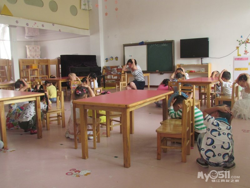 1、就地避震: 听到第一次号令后(喊话器),按上述动作要领的要求,教师迅速指挥幼儿蹲在课桌下就地避震。