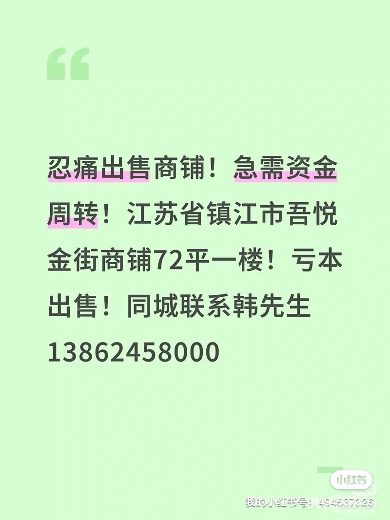 忍痛出售商铺!急需资金周转!江苏省镇江市吾悦金街商铺72平一楼!亏本出售!同城联系韩先生13862458000#急售商铺