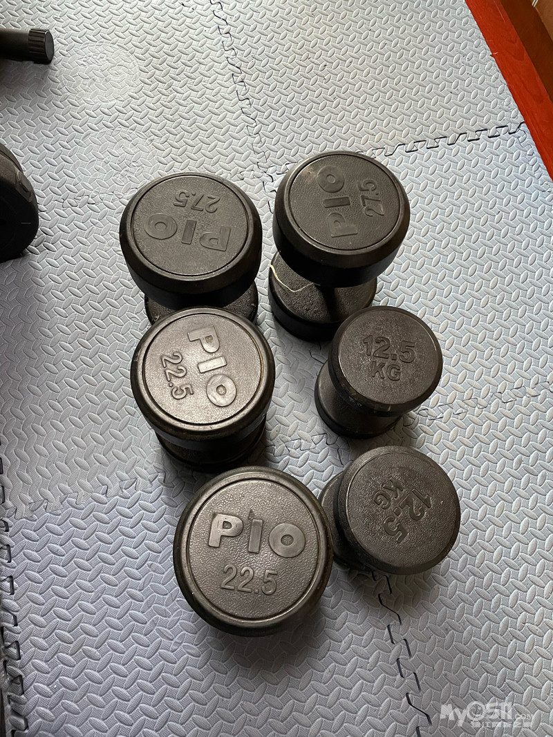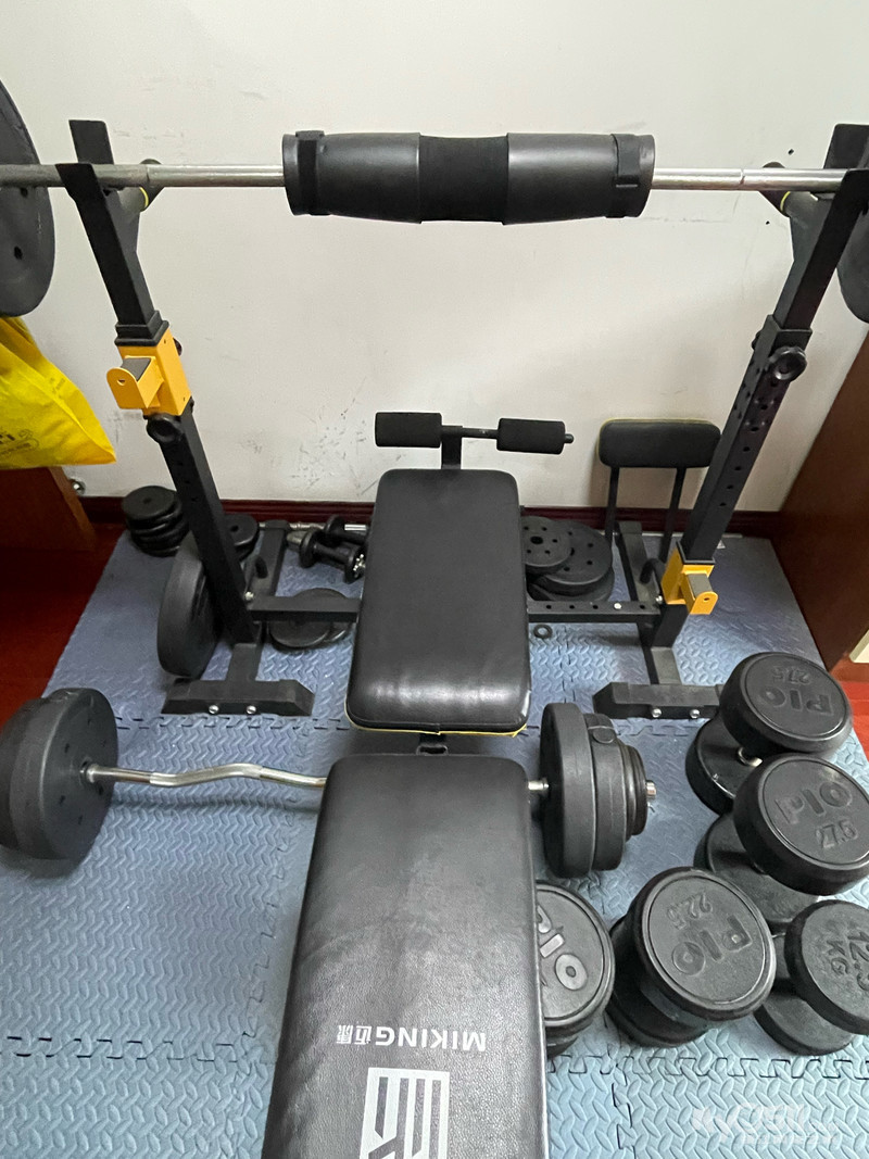 杠铃架,凳,杆,片(97公斤)整套500。哑铃12.5公斤一对,22.5公斤一对,27.5公斤一对,4/公斤。屈臂杆(1.2)米30。