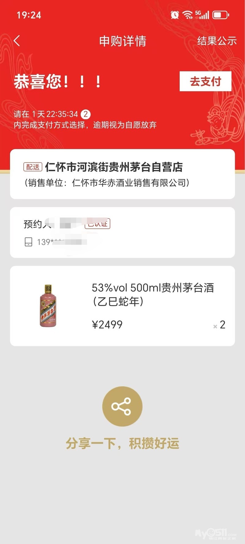 朋友昨天在i茅台中了2瓶蛇年生肖茅台,有需要的朋友和我联系,这个直接填您的地址,茅台公司发货,价格您来出,有诚意即可,13952944133微信同号