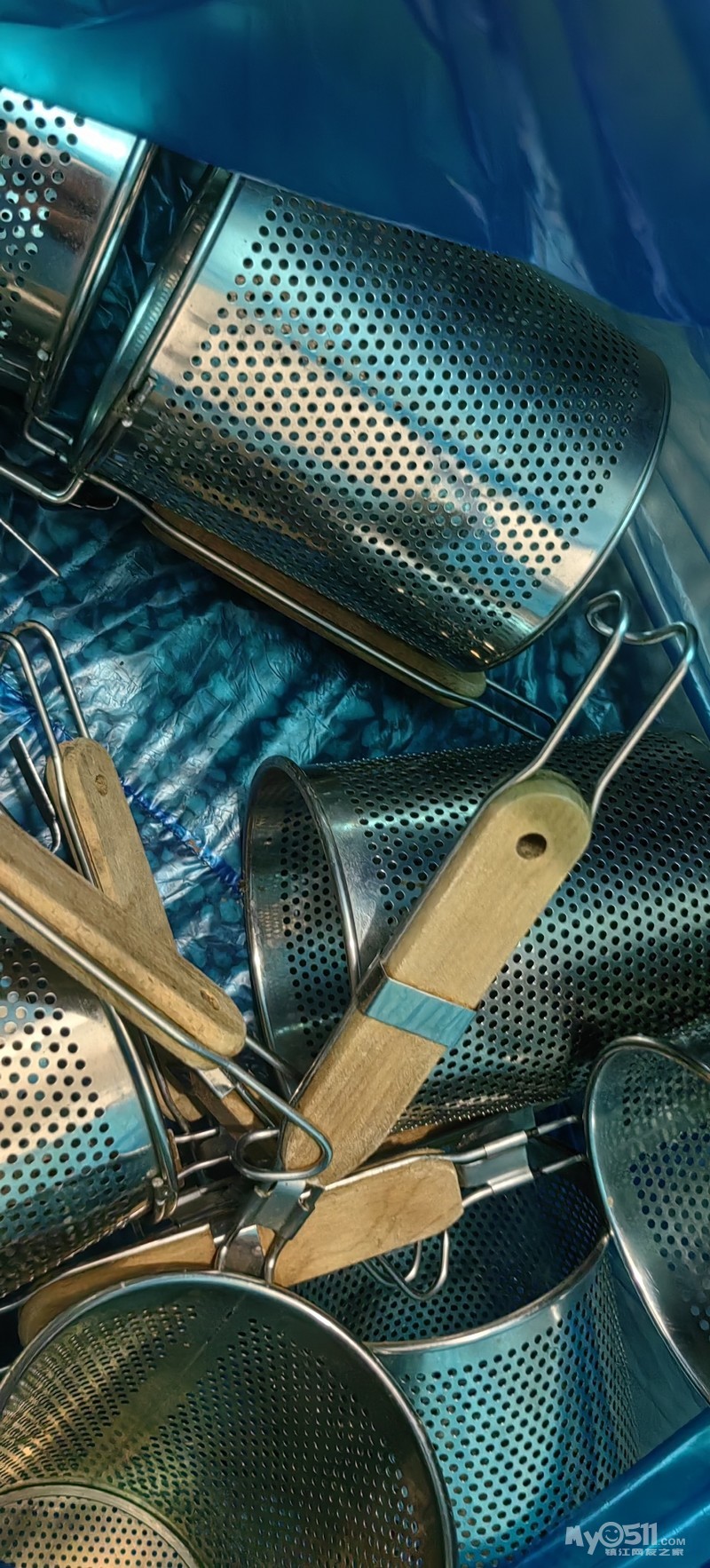 一些漏勺烫粉丝的,全新,还有十个,桶有三个带盖子可卤菜,塑料盒子二三十个,一次性头套便宜出,给钱就卖