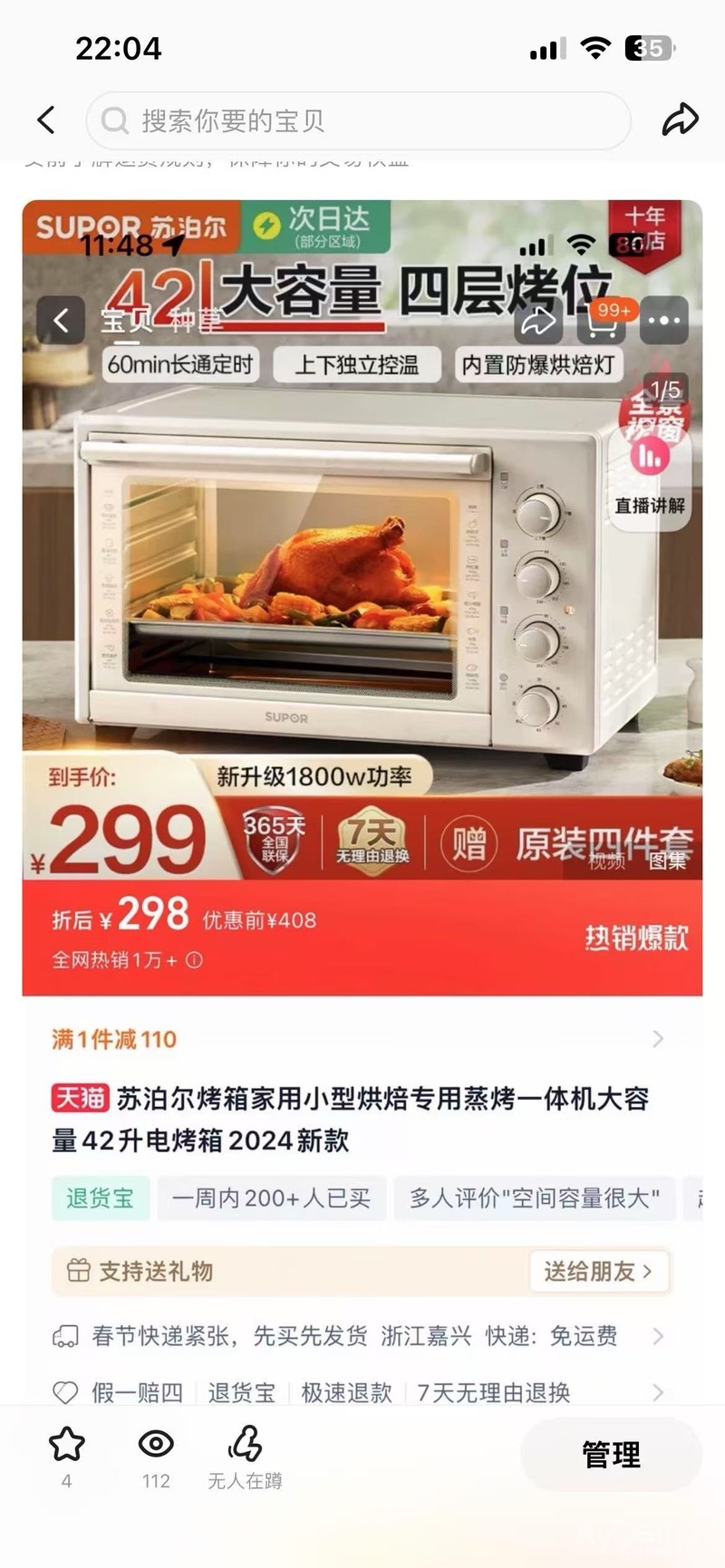 42升大容量,1800W功率,多功能独立控温,内置防爆烘焙灯。买来一次未使用,功能完好无损。因家里闲置,现低价转让。