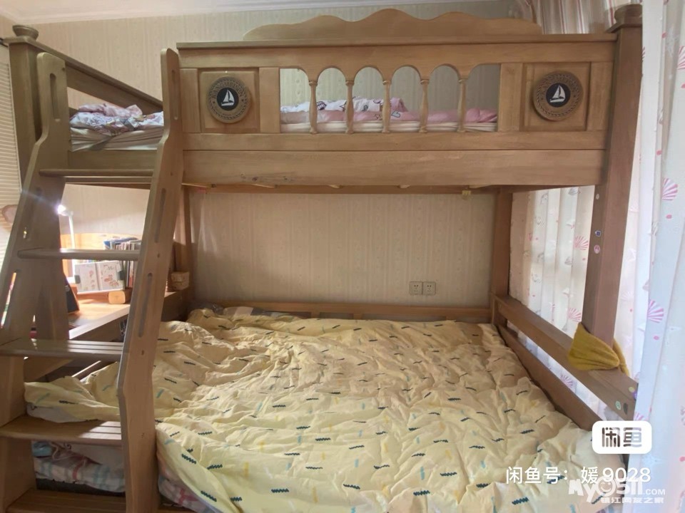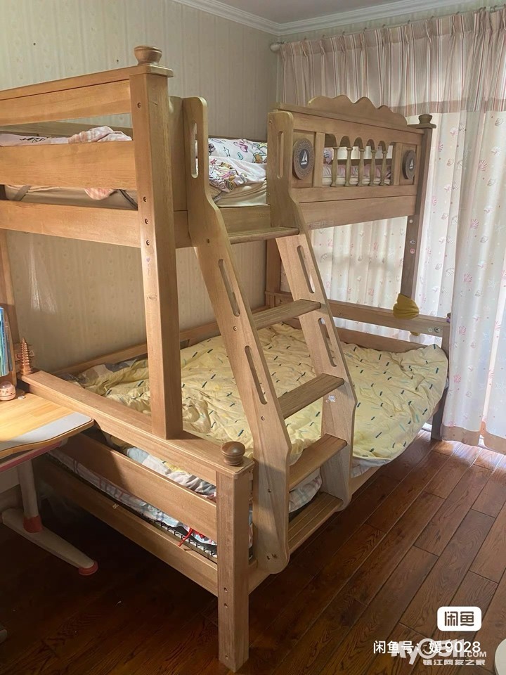» 实木高低床,原木色,上下铺都有护栏,做工精细。床板厚实结实,适合儿童使用。