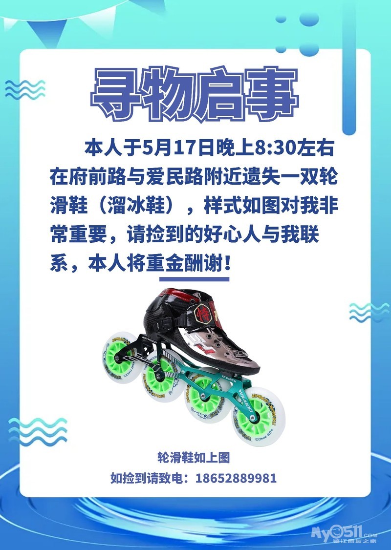 丹徒新区广场府前路与爱民路交叉路口遗失一双轮滑鞋,捡到的练习