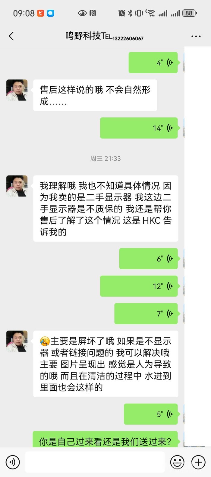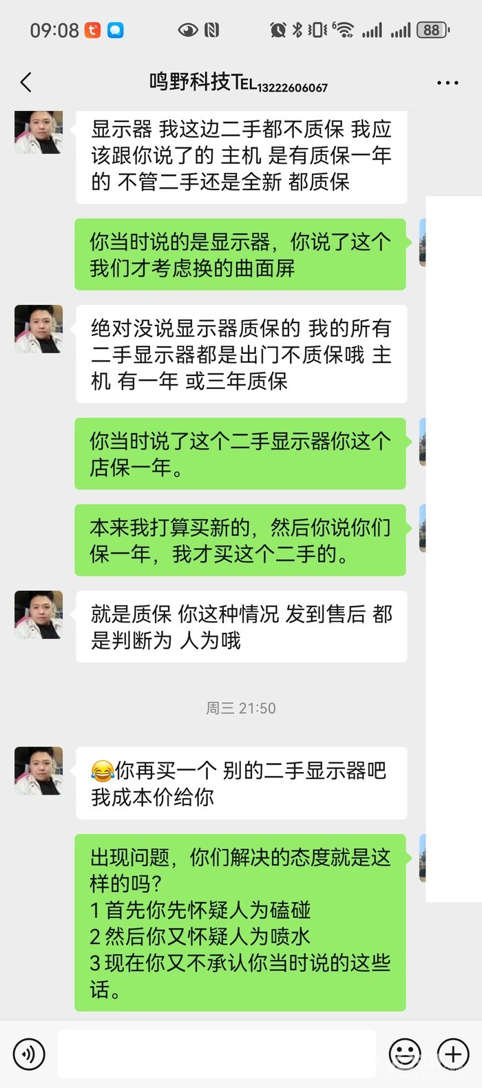 HKC:曲屏无边框32寸 1K 165Hz 成色完美 价格:580元(详见截图),被他已现场外观有瑕疵才这个价格,最后拿了完好外观并以860元买下。现在才过去3个月多,屏幕自己鼓包(外观完好无瑕疵)导致显示不全。去找店家,对方直接咬死说是人为磕碰导致,后续发了细节图(详见附图)外观完好,又开始耍无赖说他家显示器不质保,买前买后态度天壤之别。低价平台引流,在忽悠高价卖出,买前各种承诺,买后各种耍赖,完全不讲诚信。备注:他家目前门店看起来很大,其实是之前装修公司装修的,后续不租了