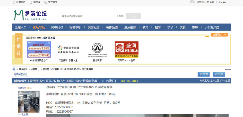 在这里买二手显示器一定要小心,最后当面仔细监测,或者找个懂行的帮忙鉴定!我也在这个论坛里两过两个显示器,一个是个人闲置,一个是商家的,本着信任对方都是本地人,应该值得信任,结果回来后,很快都出现了质量问题!如果当里买的时候认真监测应该是可以发现的!吃一堑长一智,以后一定要当心!防人之人不可无啊!