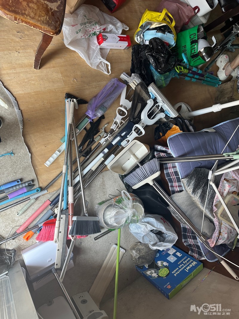 有拖把,扫帚,水瓶,饭盒,电锅,水桶,衣服架子,旧鞋子,篮子