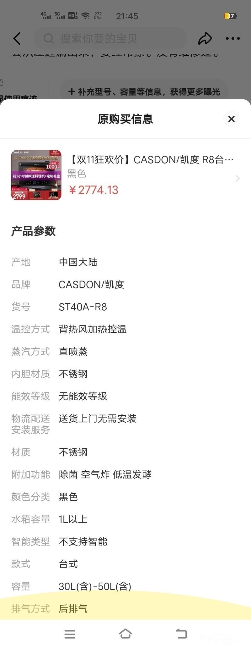 凯度ST40A-R8台式蒸烤箱40L,450元,配件齐全,没有外装箱,很大很重,不太好拿。2759元买的,现在全新的2300元左右。有两个故障,没修过。一是使用时经常会停下,提示要加水,实际上水箱的水是够的,按继续工作后会继续工作。二是水会从水箱左边漏出来,漏到台子上,要经常擦。没有维修过。闲置不用了。大致尺寸左右长50*前后宽49*高42,花山湾二区自取