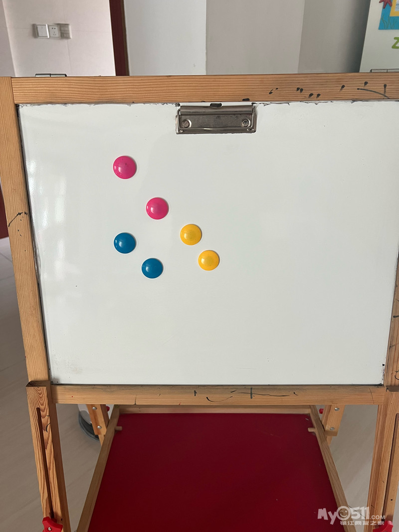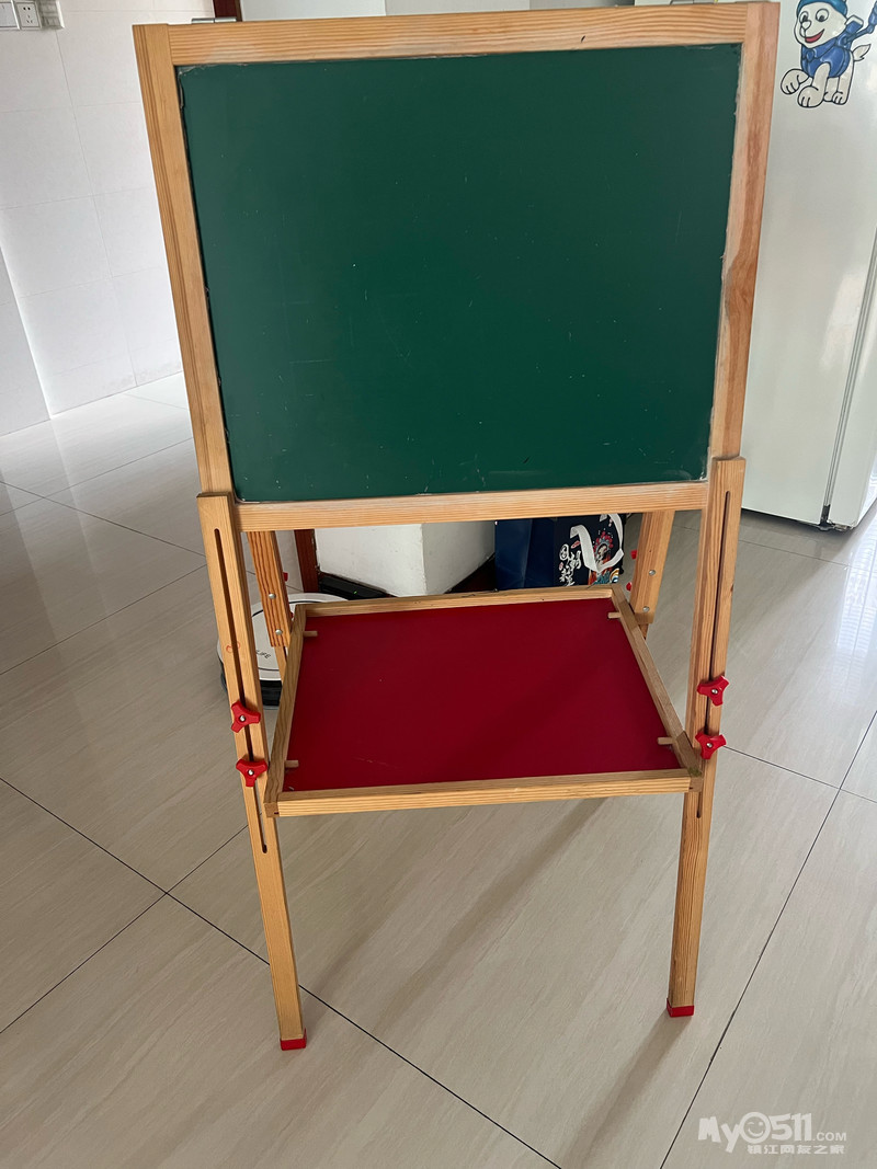 闲置的儿童支架双面黑板,高度可以调节,提供黑板擦、小磁珠6个、粉笔套。