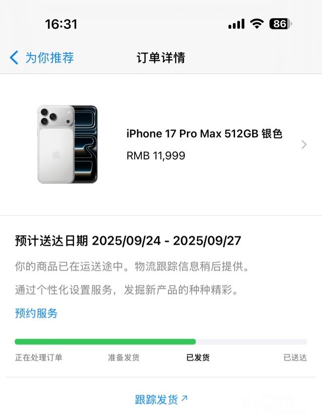 iPhone17Promax512白色明天到货需要的滴滴