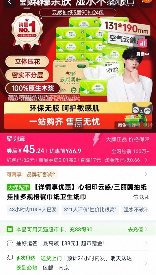 心相印抽纸,27包一箱,100抽一包 S码,25一箱,万达附近可送上门