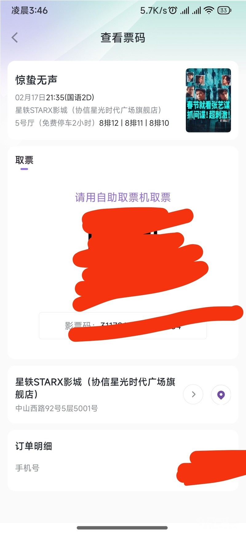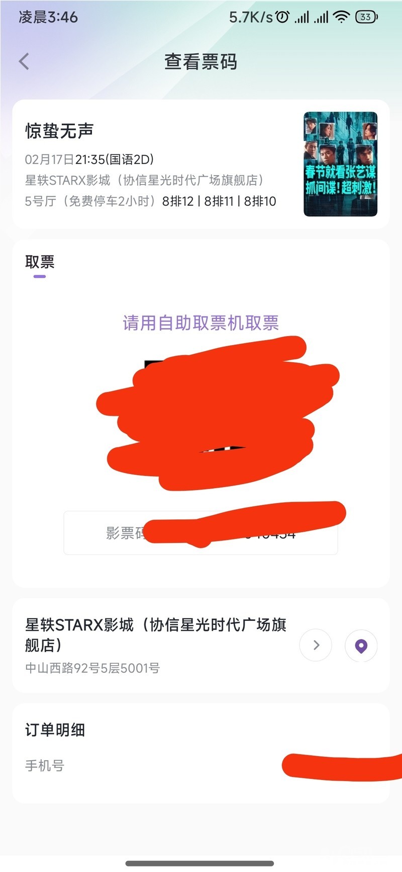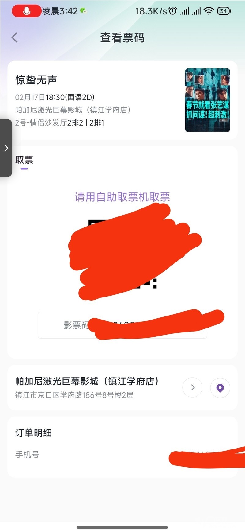 2026.2.17电影票《惊蛰无声》共六张,一张20元,镇江市