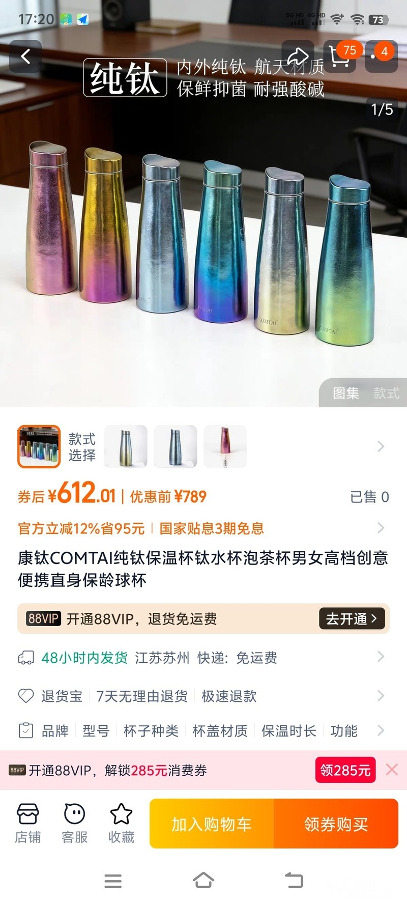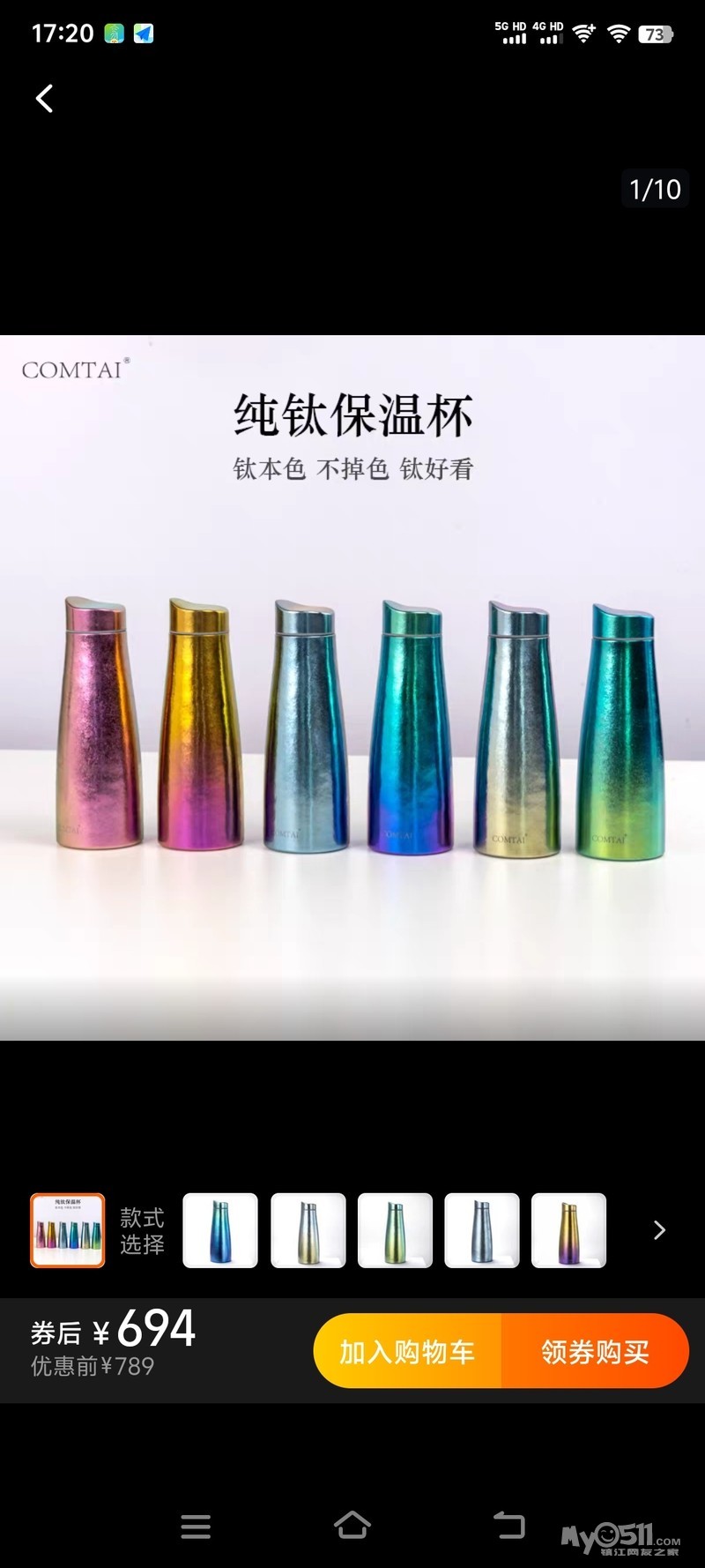【康钛COMTAI纯钛保温杯】金紫炫色,双层真空,纯钛材质,保温效果好,耐腐蚀,适合泡茶喝水。全新,未使用。正品,支持自提。江苏镇江大港。350元,15862981577