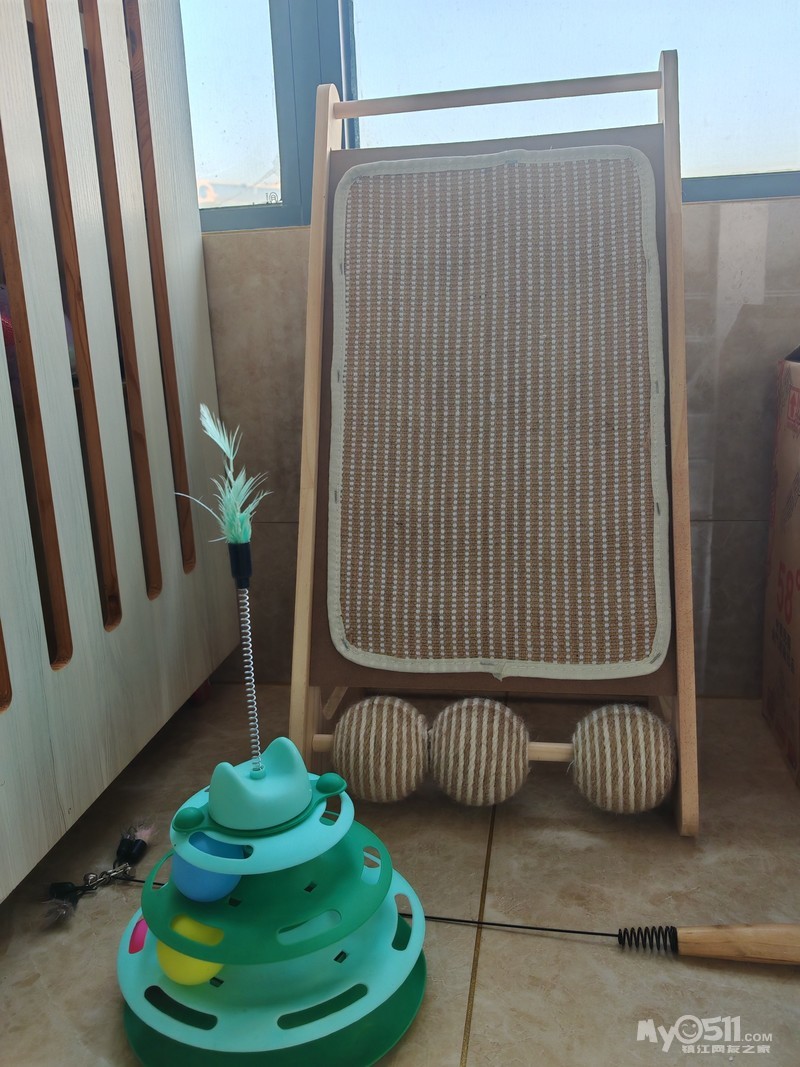» 三茅宫9成新实木三层猫别墅带150,全新转盘玩具8,全新不掉屑猫抓板20。