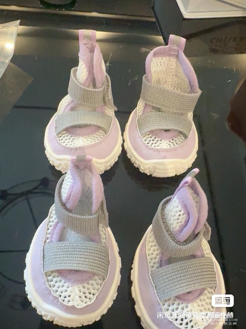 【佳美乐宠物凉鞋】紫色网面款,55码,适合19-25斤小型犬,四只装,全新,魔术贴设计,穿脱方便,透气不闷脚,软底防滑,夏天外出很合适。需要可以联系我,15050884686,微信同号