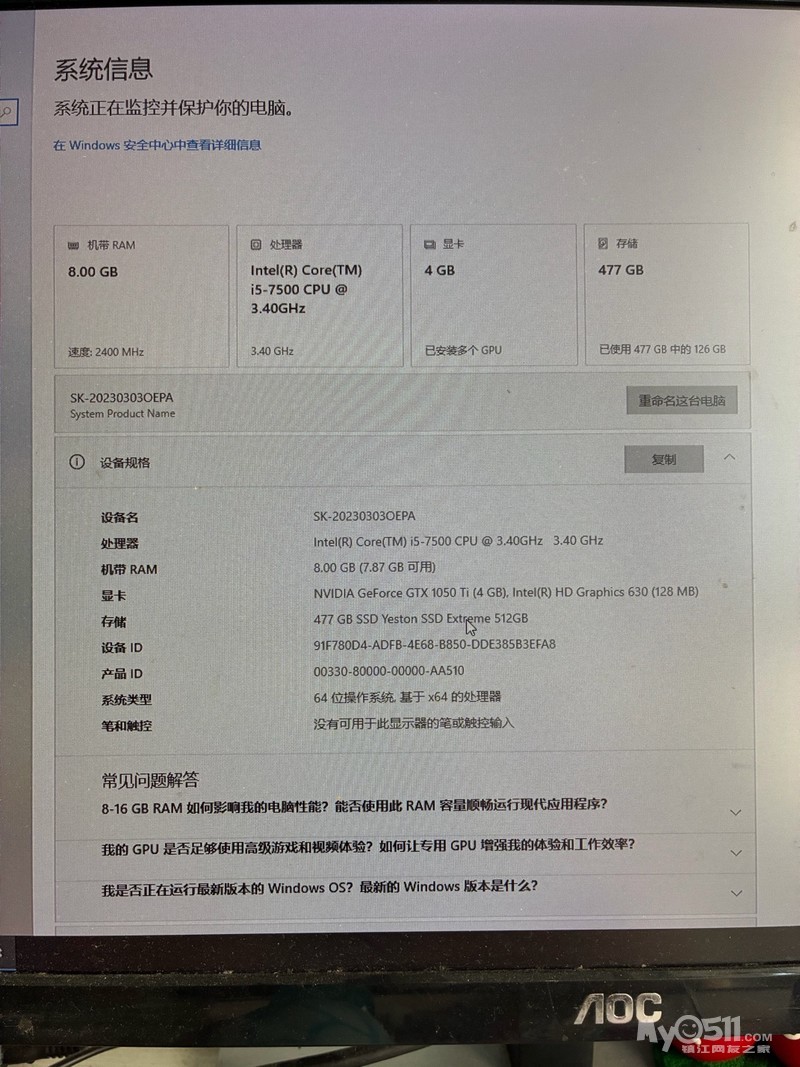 一套电脑,在天猫京天华盛旗舰店配的,aoc显示器、主机处理器i5-7500、显卡gtx1050,当时配的算比较高的了,没怎么用过,一直放着,开机贼快,出给需要的朋友,送键鼠耳机其他配件,丹徒自提