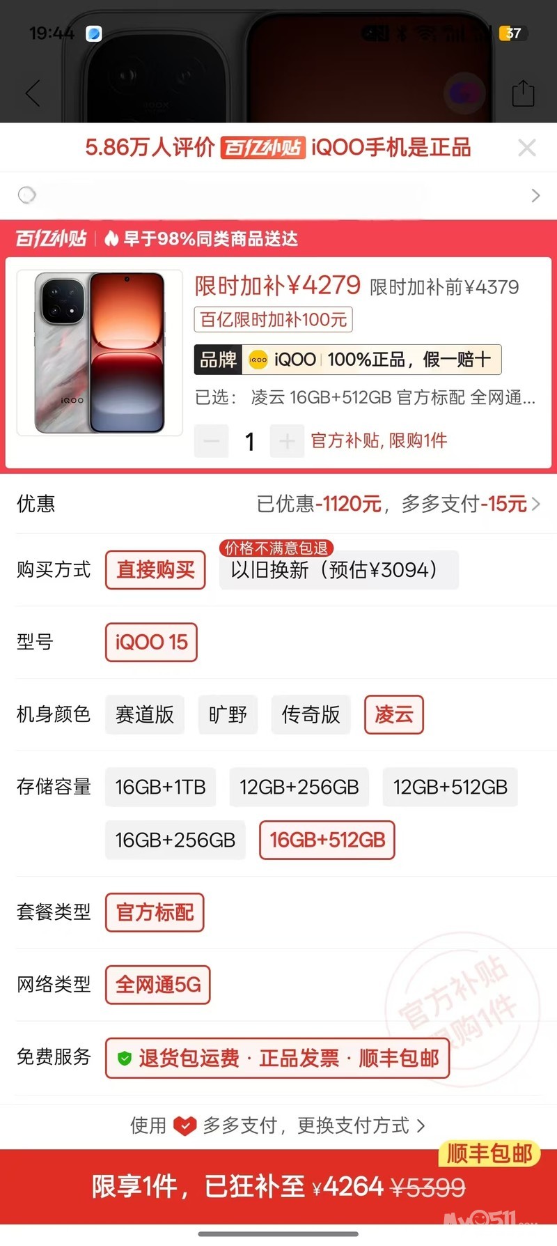 出一部线下刚买的iQOO15零云版16+512版本2026年4月4号激活 [广告推广]