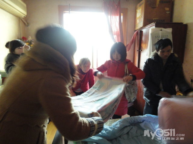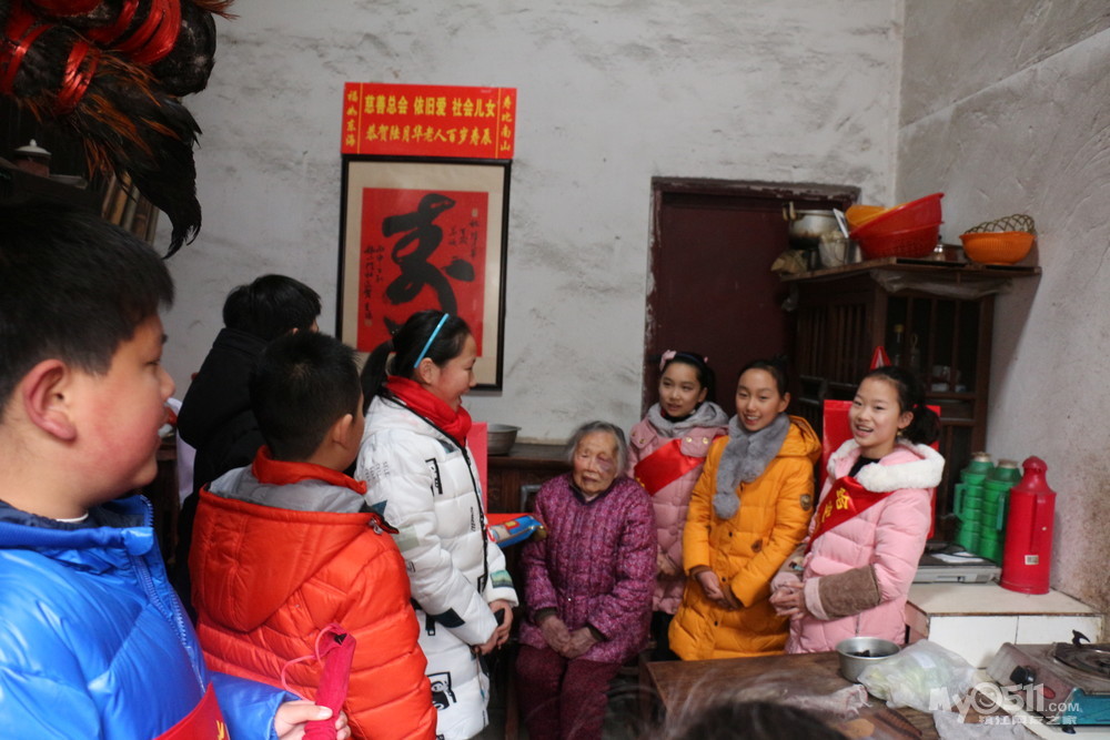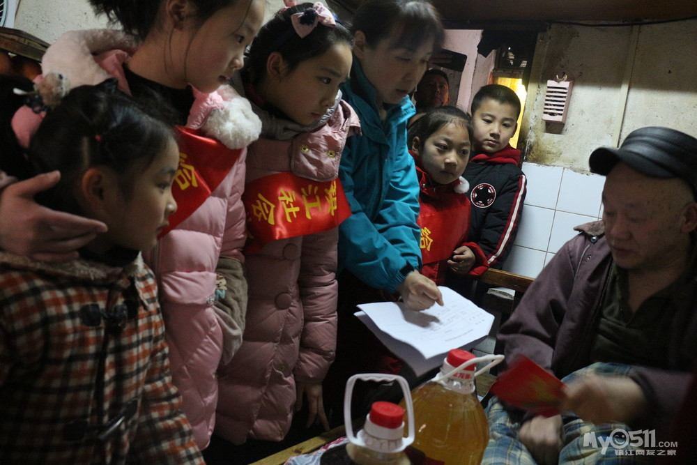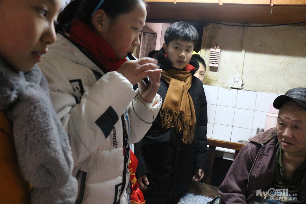 我们组到达孤寡老人居住的大西路三巷广场和大龙王巷后,我们惊叹不已,第一位老爷爷住在仅仅5平方米的房间,既阴暗又潮湿,志愿者们只好分批进去拜年,送慰问礼品、表演简单节目。我们的到来,老人显然很开心,他饱经风霜的脸上绽开了笑容,他不停地道谢,深陷的眼窝里流出了感激的热泪,这一刻,我也被感动了。