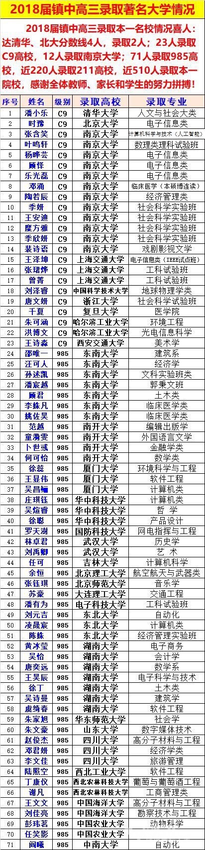 朋友圈里才看到的。一中985,80个。镇中985,71个。