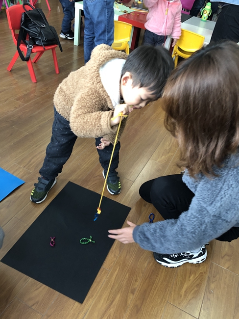 小型友谊赛,小朋友们用嘴咬住吸管的一头,指挥着小鱼杆利用磁铁原理吸住小鱼,