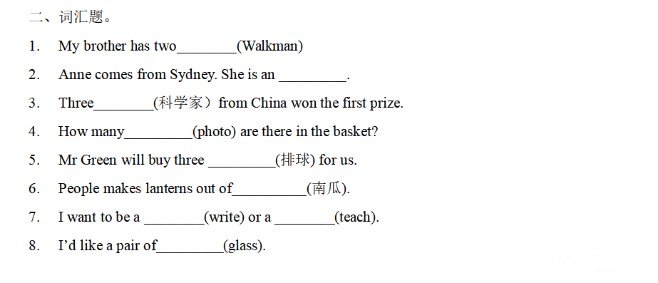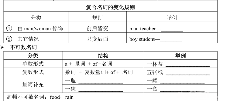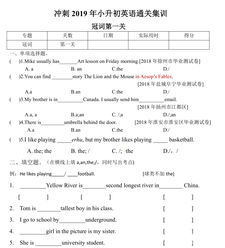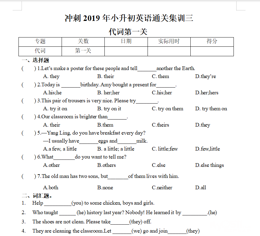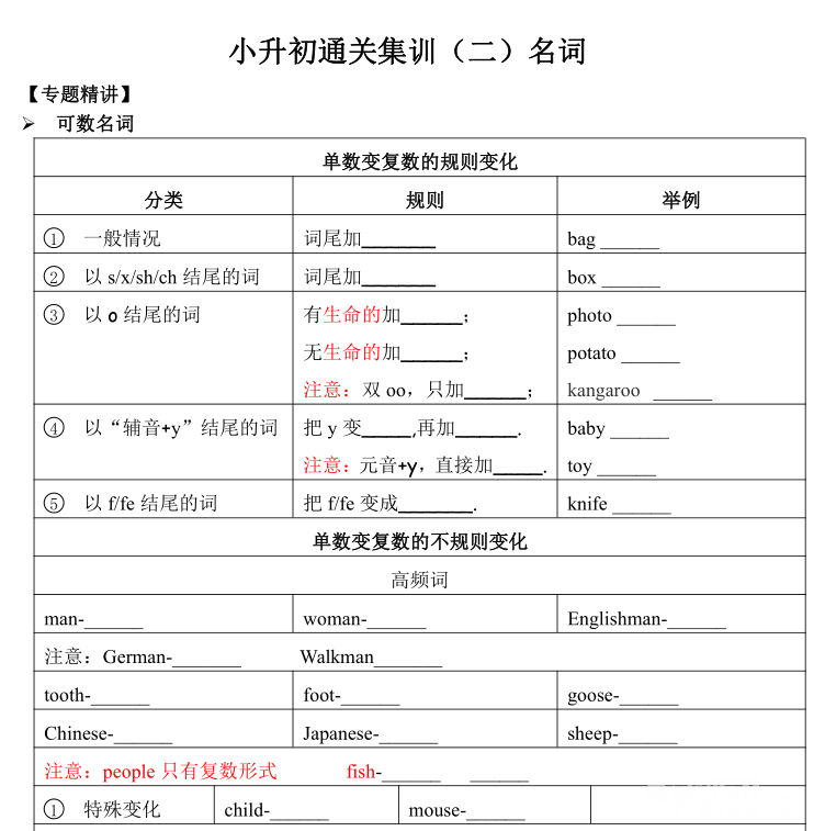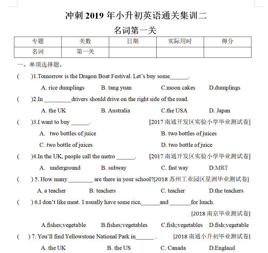 名词闯关卷已经上传,名词考察有:不可数名词的判定,复数变形,文化常识等。尤其文化尝试较难一些,需要孩子的视野开阔(涉及的有交通规则,名胜景点,国家文化等)