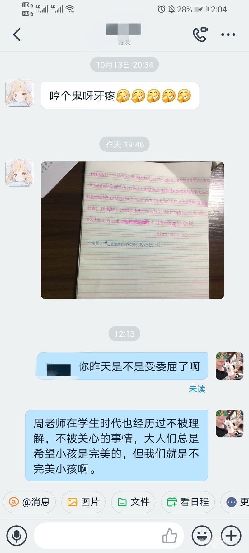 收到孩子写得一封信,六年级,不方便过多介绍她,但是看到这些文字的时候,担心,心疼。最近镇江教育圈确实发生了很多不太好的事情。简单聊几句,路过的朋友点个赞。原生家庭给我们带来的影响是长远的,甚至是一辈子的。体会过得人肯定懂。但老师呢,社会呢,同样会在童年或者青春期给孩子造成不可磨灭的痛苦。昨晚我就梦见高中班主任了,梦里的生活很平常,但气氛很压抑。我因为一次在篮球场的打架,被班主任长期冷嘲热讽,其实我那时候成绩很好,我很想好好专注的学习,但是他一直说我一直说我,我崩溃了,转学了,然后选择性淡忘。所以我现在小心翼翼。不去责备,刺激任何一个孩子。学生时代,我们都是敏感的,老师的言语有时候会伤害你很多年,让你失去信心,高中班主任当时一直打击我,这么多年过去,居然梦里我还都是自卑的。我真的不去在乎这些,但是细想,那几年对我一生肯定是有影响的,不然我不会潜意识里还记得,不然我不会主动和高中同班同学一个都不联系。及时后来有人想靠近我,我都拒绝了。第一次做这个梦。这些不会给现在的我带来压力,反而我认为是一种成长,人总是拒绝成长到成长,使我更清楚的认识自己。同时,我也祝愿所有的孩子们,能快乐成长,大人也要懂得蹲下去用孩子的眼光看待这个世界,因为《小王子》里曾说,所有的大人也是小孩,只是你们忘了吧。抱抱身边的不完美小孩,也许她们只是心情不好,所以才会甩脸色给你看!